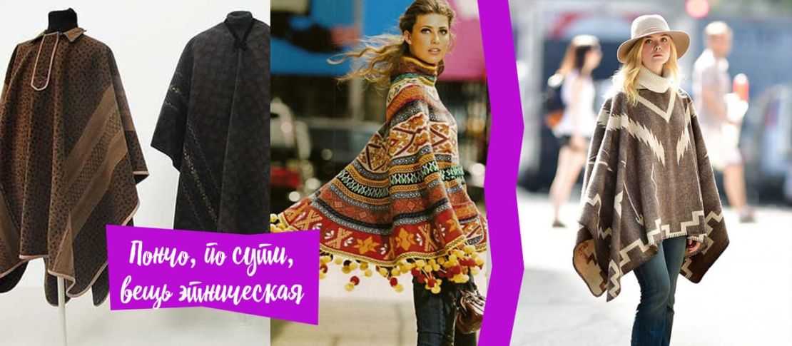 Пончо — это одежда индейцев Южной Америки, то есть, по сути, вещь этническая. А потому она имеет простой, даже примитивный крой (в данном случае, просто прямоугольник с отверстием для головы). Конечно, современные пончо не столь примитивны, дизайнеры украшают их различными дополнительными деталями, но суть вещи остается прежней — это вещь народного кроя.