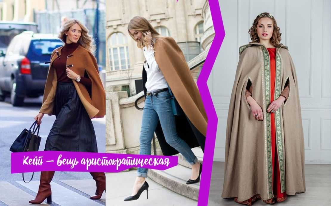Кейп — вещь более аристократическая. Само слово — кейп — означает «накидка». Эта вещь имеет более сложный крой, обрисовывающий плечи, и по своей конструкции близка к классическому пальто, только без рукавов — их заменой могут служить прорези, но есть и кейпы сплошные. Кейпы отсылают нас к плащам аристократов, а также к вещам в классическом стиле. Присутствует и аллюзия на небрежно накинутое на плечи пальто или жакет. Особенно популярными были кейпы в 20-х и 60-х, 80-х годах ХХ века, и вот сейчас они триумфально вернулись на подиумы и в нашу жизнь.