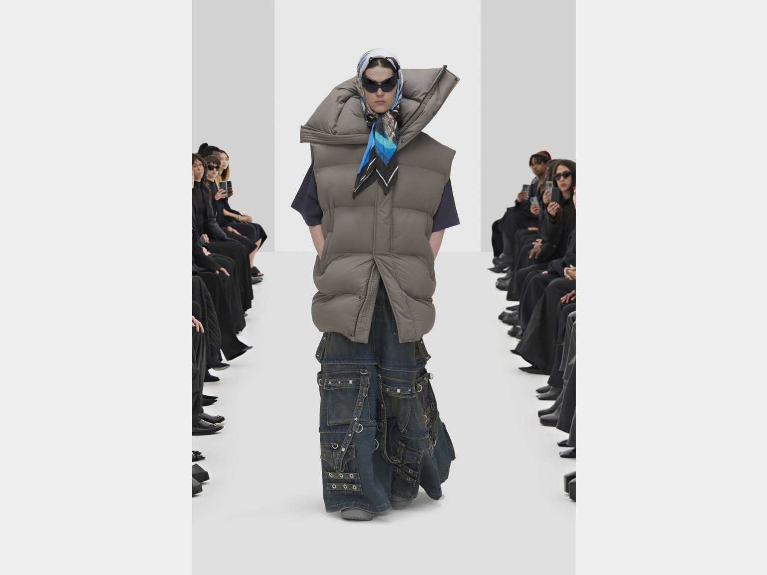 Очень объёмные пуховики и куртки стали знаковыми вещами бренда. При этом акцент в районе плеч и шеи и силуэт, будто создающий пьедестал для головы, — это ясная отсылка к тому, что создавал сам основатель модного домаФото: Balenciaga