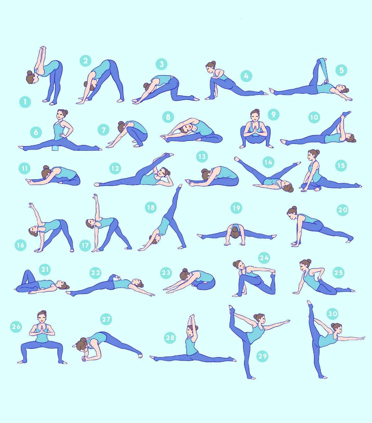 Каждый день во время испытания вы должны делать растяжки с номерами от 1 до 5 (из 30), ваши базовые растяжки. Затем в день 6 вы будете делать с 1 по 5 и 6, а в день 18 вы будете делать с 1 по 5 и 18 и так далее и так далее, удерживая каждую растяжку в течение одной минуты и растягивая в общей сложности 10 минут. день. Шеппард подтверждает, что разнообразие растяжек в этом 30-дневном испытании было очень полезным, потому что каждая растяжка помогала проработать все эти маленькие мышцы.
