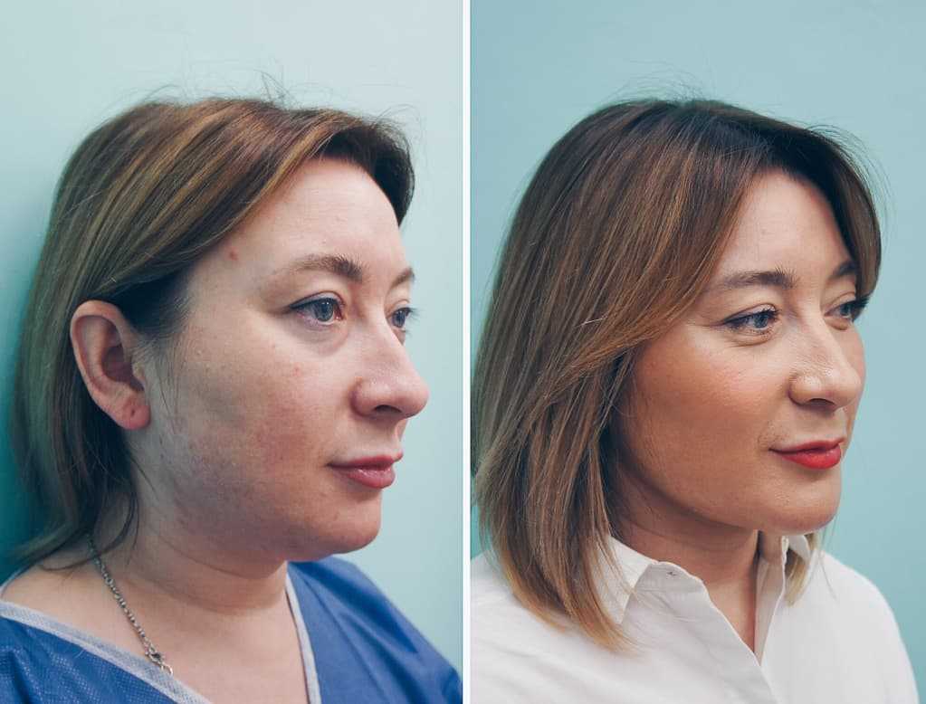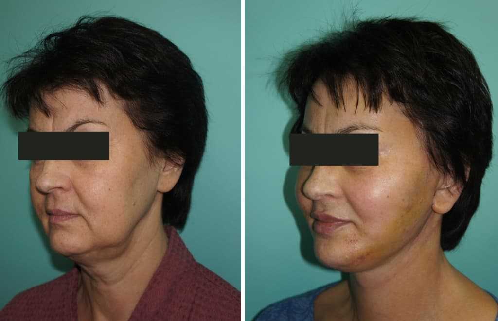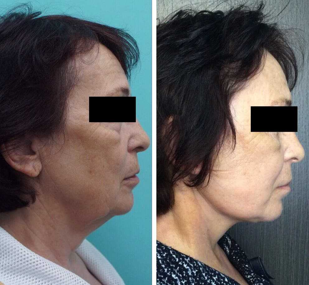 Лазерная нанолипосакция подбородка, моделирование лица собственным жиром, нитевой лифтинг нижней трети лица по методике А.Искорнева. До и через 4 дня после процедуры.