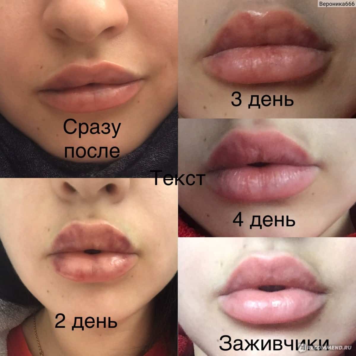Боль в губах может сохраняться после приема препаратов гиалуроновой кислоты. Обычно это занимает не более недели. В первый день после операции рекомендуется ограничить чрезмерную имитационную активность и употреблять горячие напитки для устранения тяжелых упражнений. В течение 10-15 дней после увеличения губ нельзя загорать, не ходит
