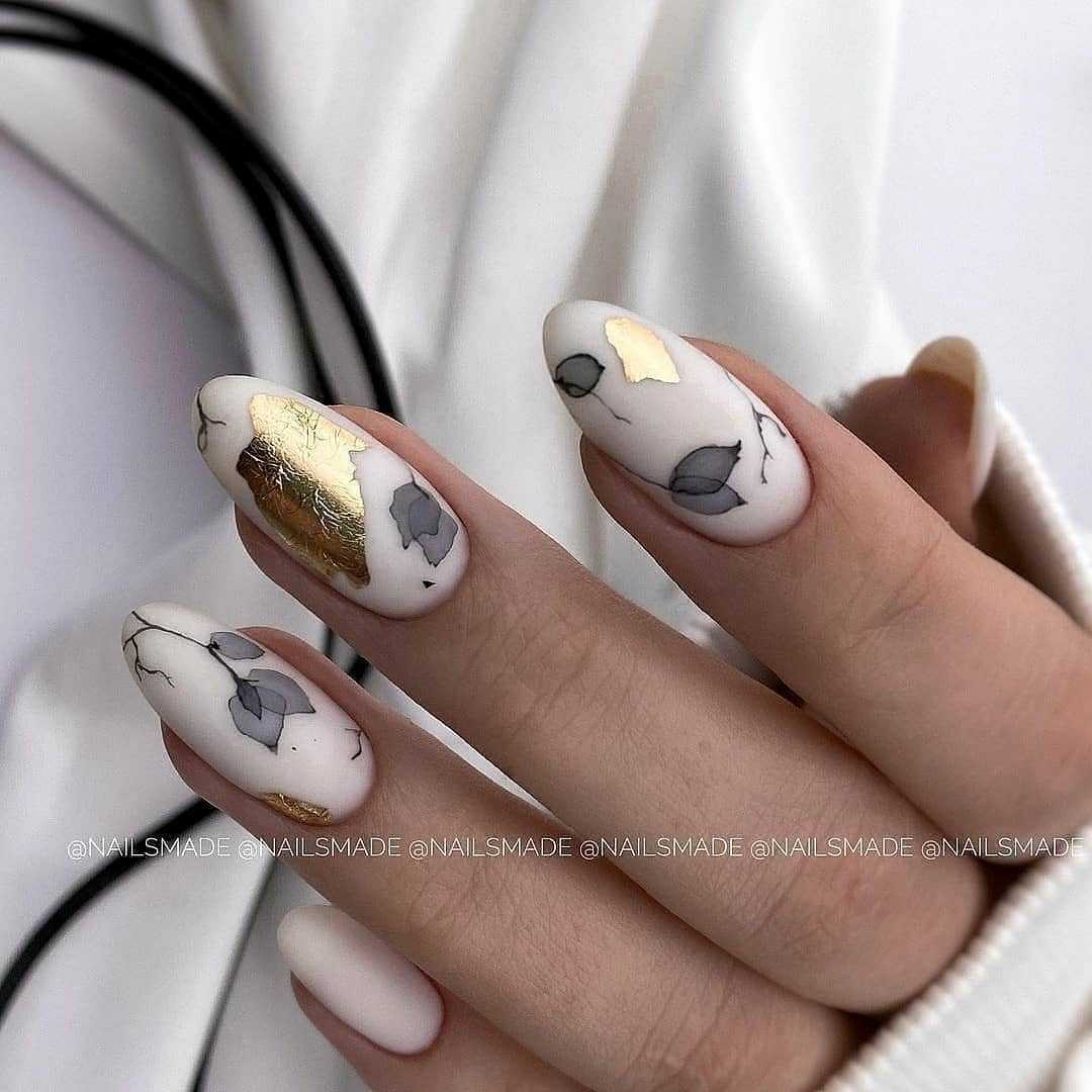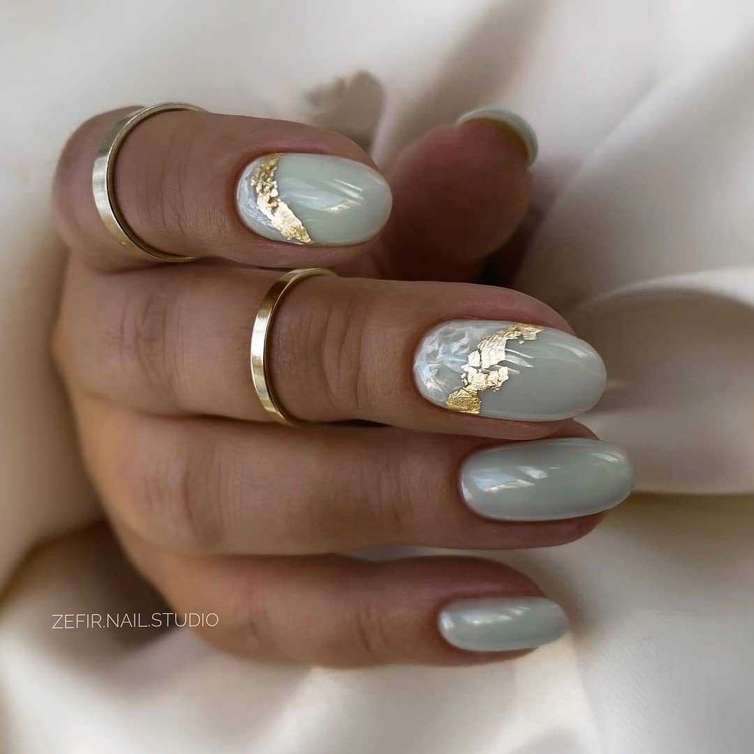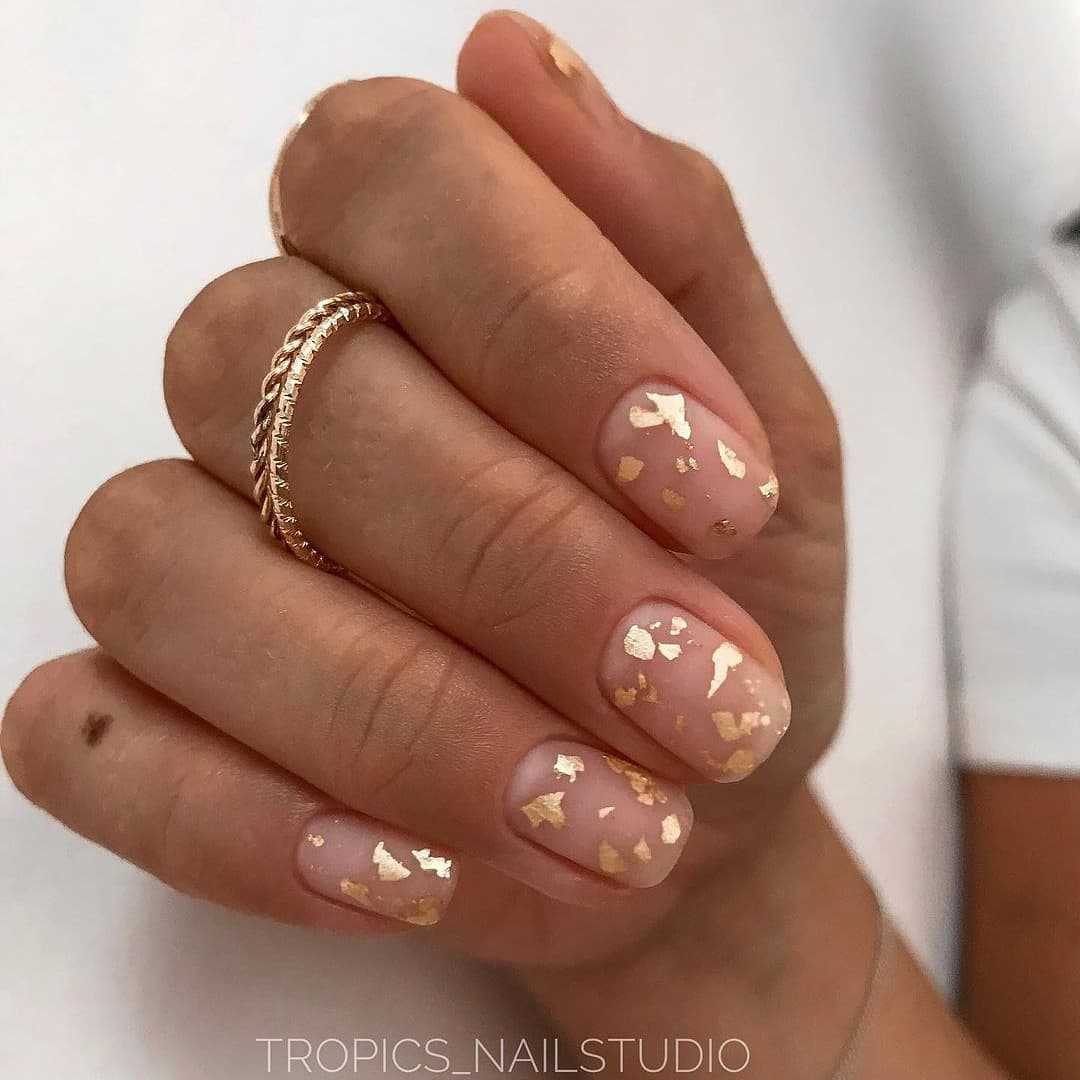Такой актуальный маникюр относится больше к торжественным и тематическим дизайнам. Но если есть желание создать более будничный, спокойный вариант, то можно выбрать в качестве основы молочную базу и нейтральные цвета, и оттенки нейл фольги.