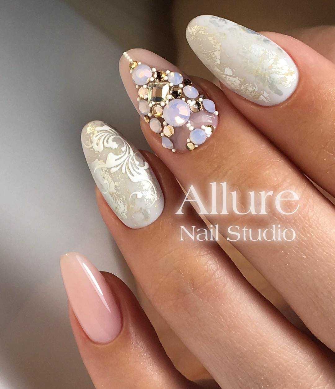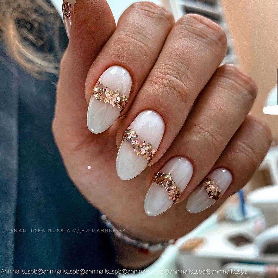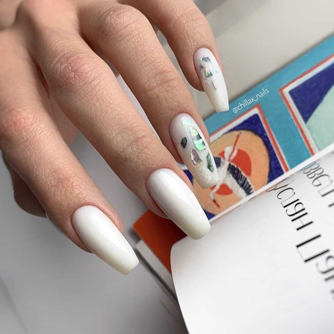 Такой актуальный маникюр относится больше к торжественным и тематическим дизайнам. Но если есть желание создать более будничный, спокойный вариант, то можно выбрать в качестве основы молочную базу и нейтральные цвета, и оттенки нейл фольги.