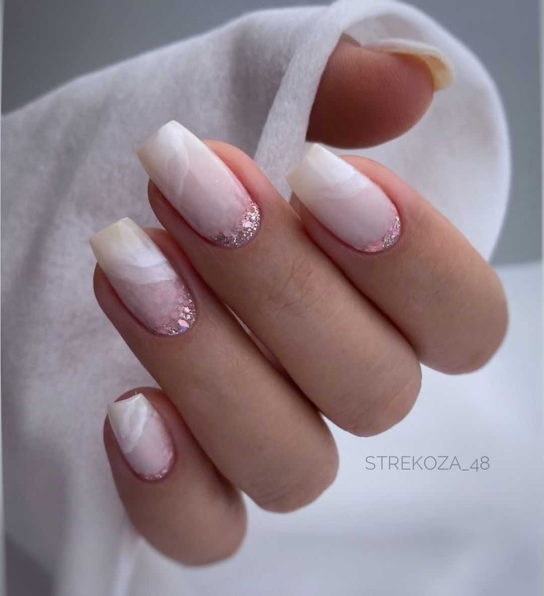 Минималистичный маникюр, напоминающий классический френч, но с легким эффектом градиента. Здесь прослеживается сочетание белого и розового оттенков. Это самый нежный вариант дизайна для летнего маникюра. Он прекрасно сочетается с любой одеждой и подходит для всех случаев. К тому же его реализация относительно проста. Ногти такого типа подойдут женщине любого возраста.