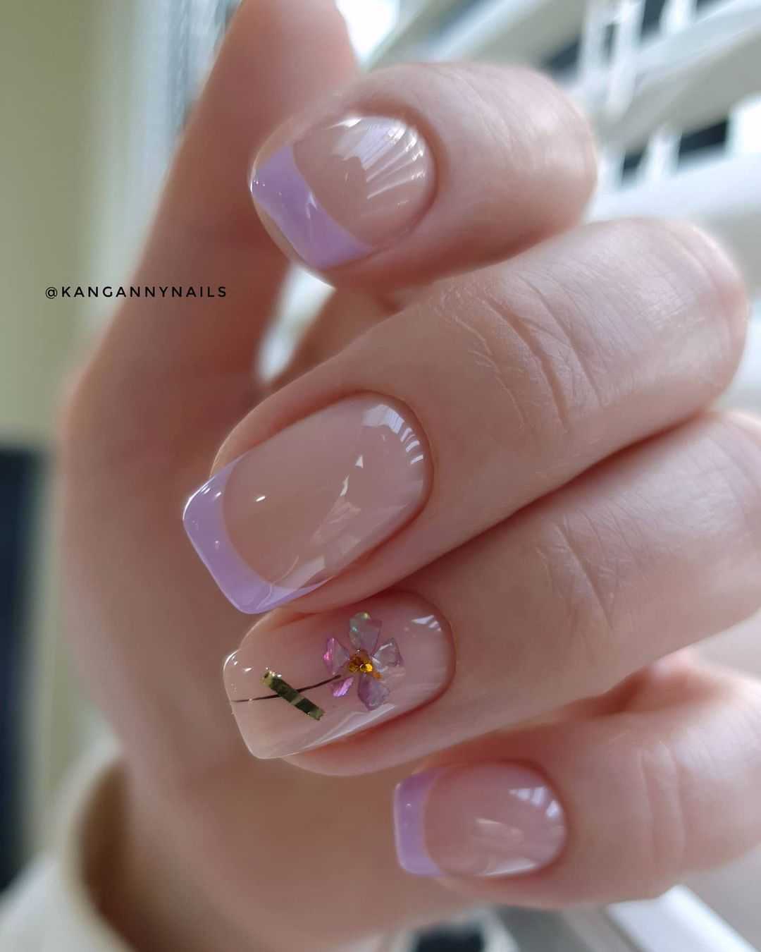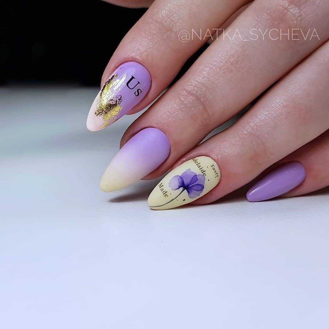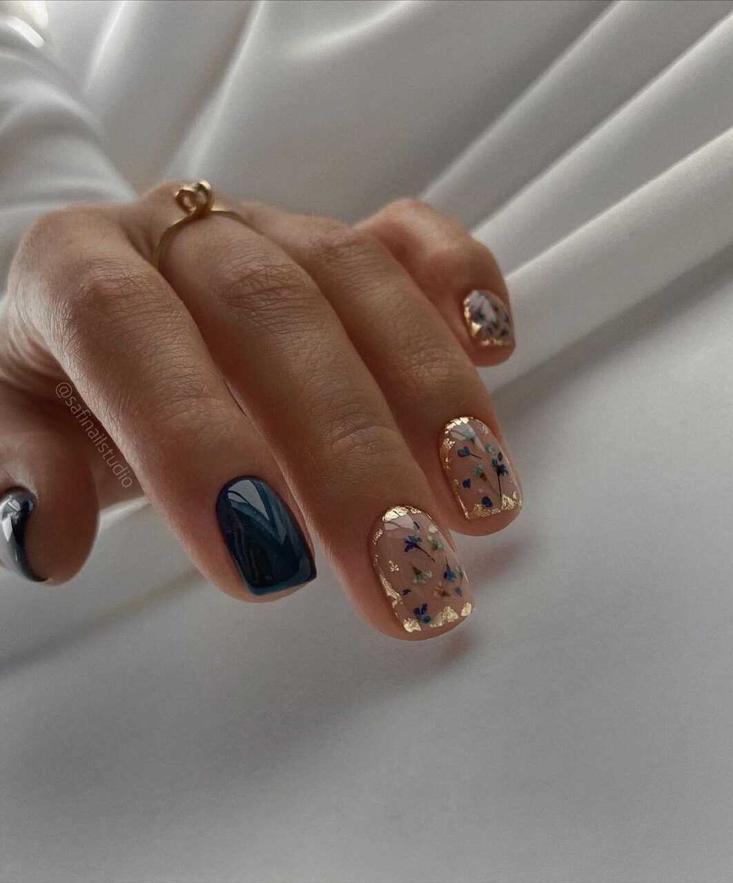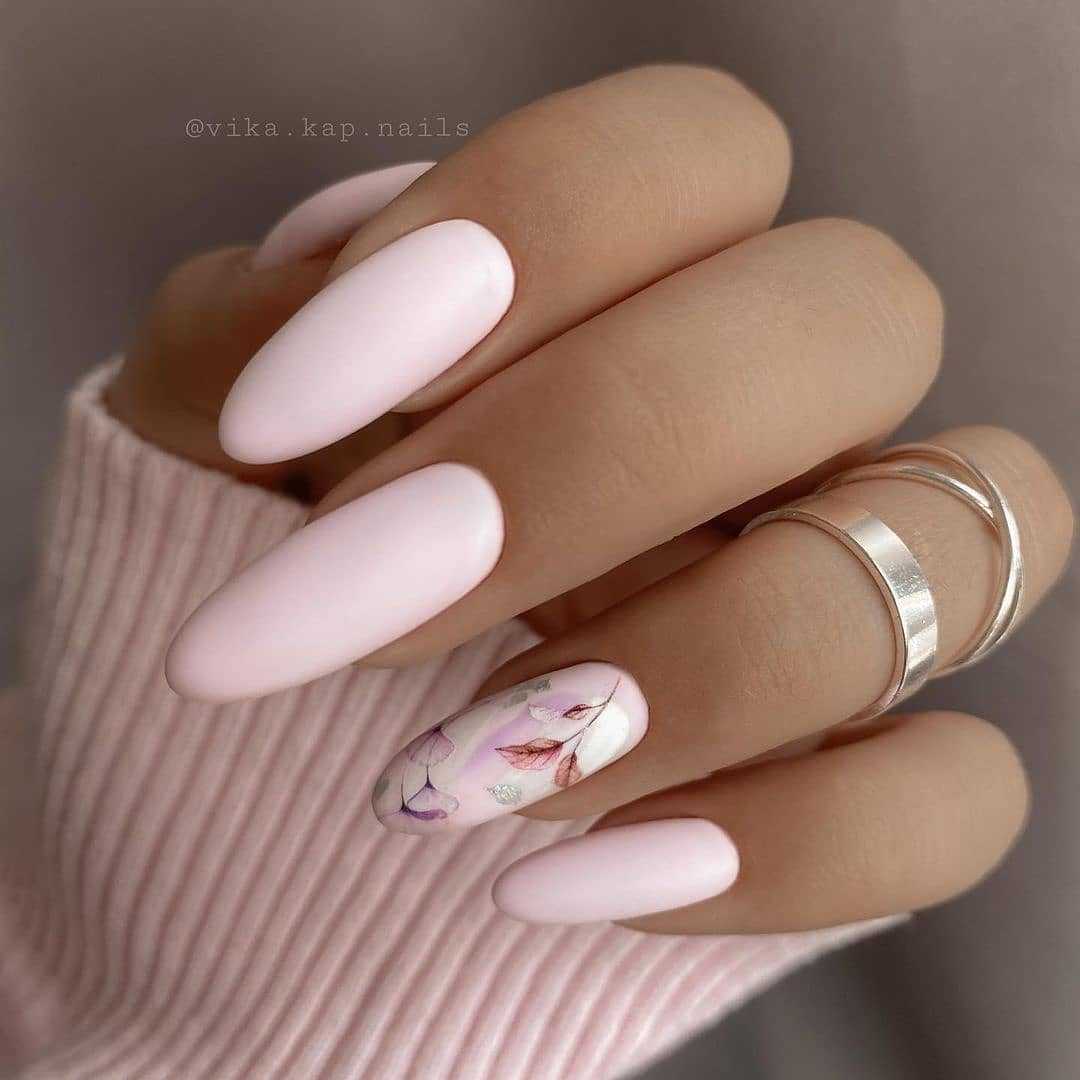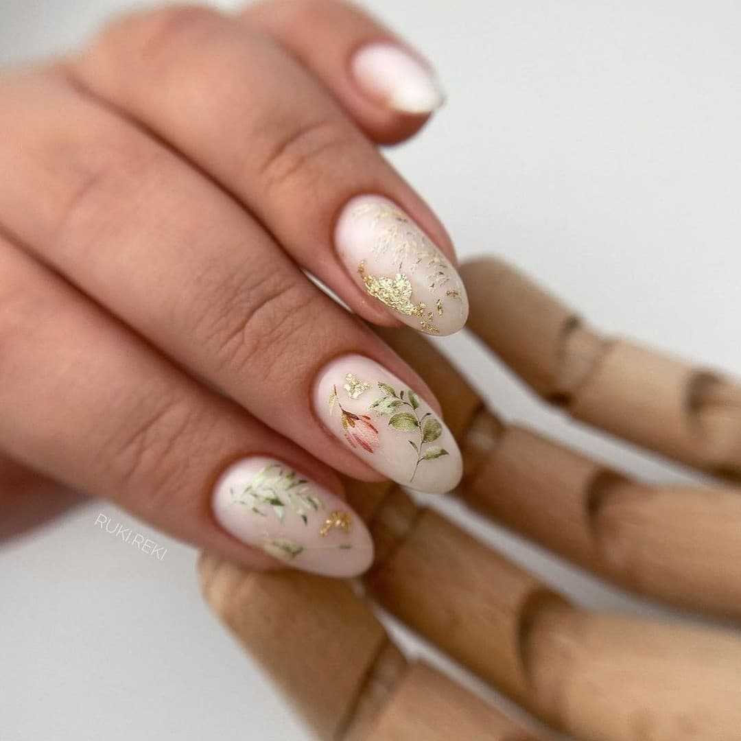 Ну и конечно же летом не обойтись без цветочных мотивов в комбинации с матовым покрытием, предпочтительно однотонной матовой основе. Изюминкой такого маникюра станет цветок, выполненный гель-лаком на ногте безымянного пальца. Не менее популярным трендом будет использование серебристой втирки или жидкой слюды, фольги и камифубуки.