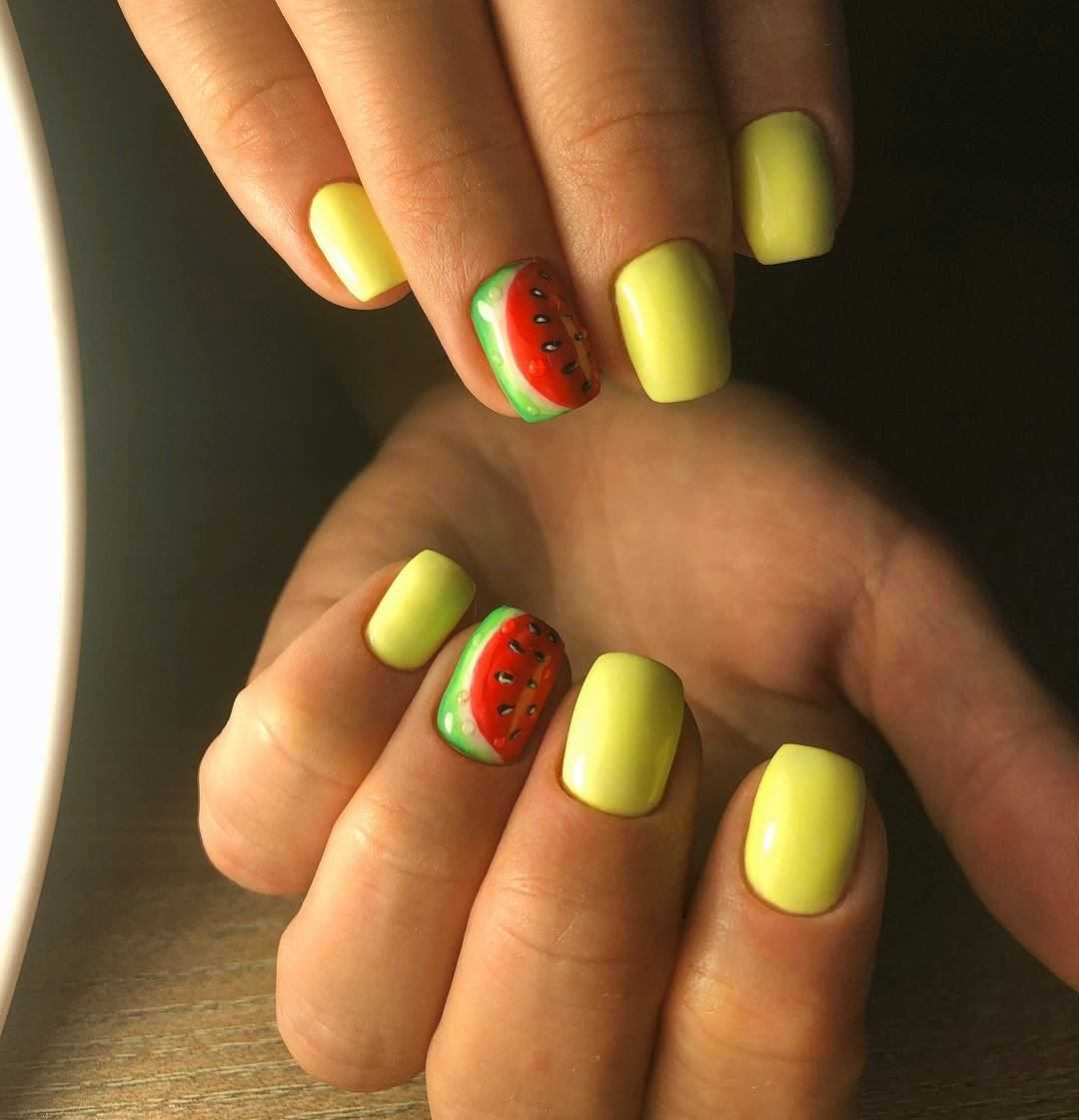 Лето у многих ассоциируется с разнообразием фруктов и ягод. Поэтому неудивительно, что такие рисунки быстро стали изображать на ногтях. Ярко-розовая отделка идеально сочетается с малиновым рисунком. Желтый маникюр и педикюр — идеальная основа для дизайна с лимонами или бананами. Красный лак чаще всего сочетается с рисунком клубники или вишни. На самом деле комбинаций гораздо больше. Поэтому рекомендуем вам обязательно посмотреть подборку идей ниже.