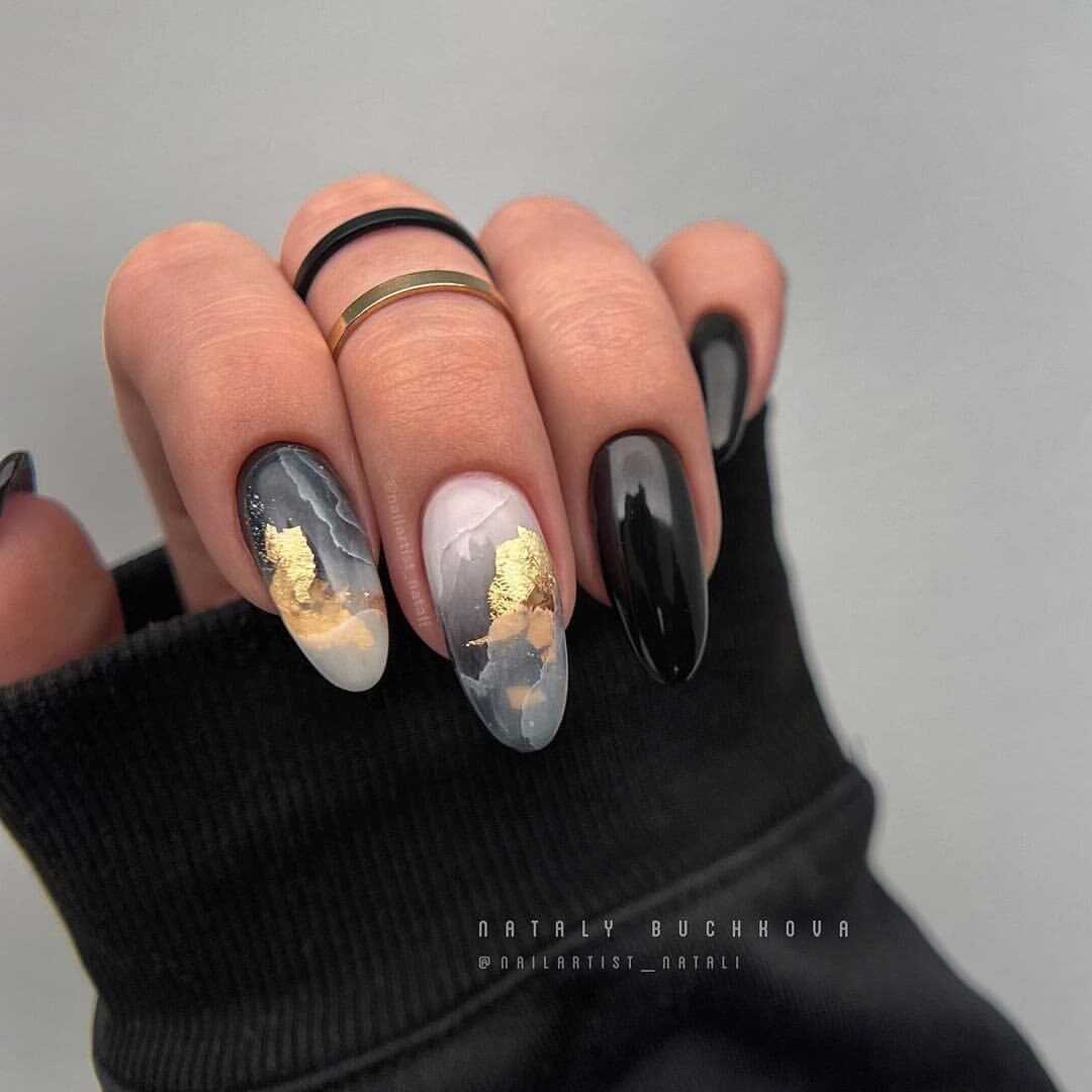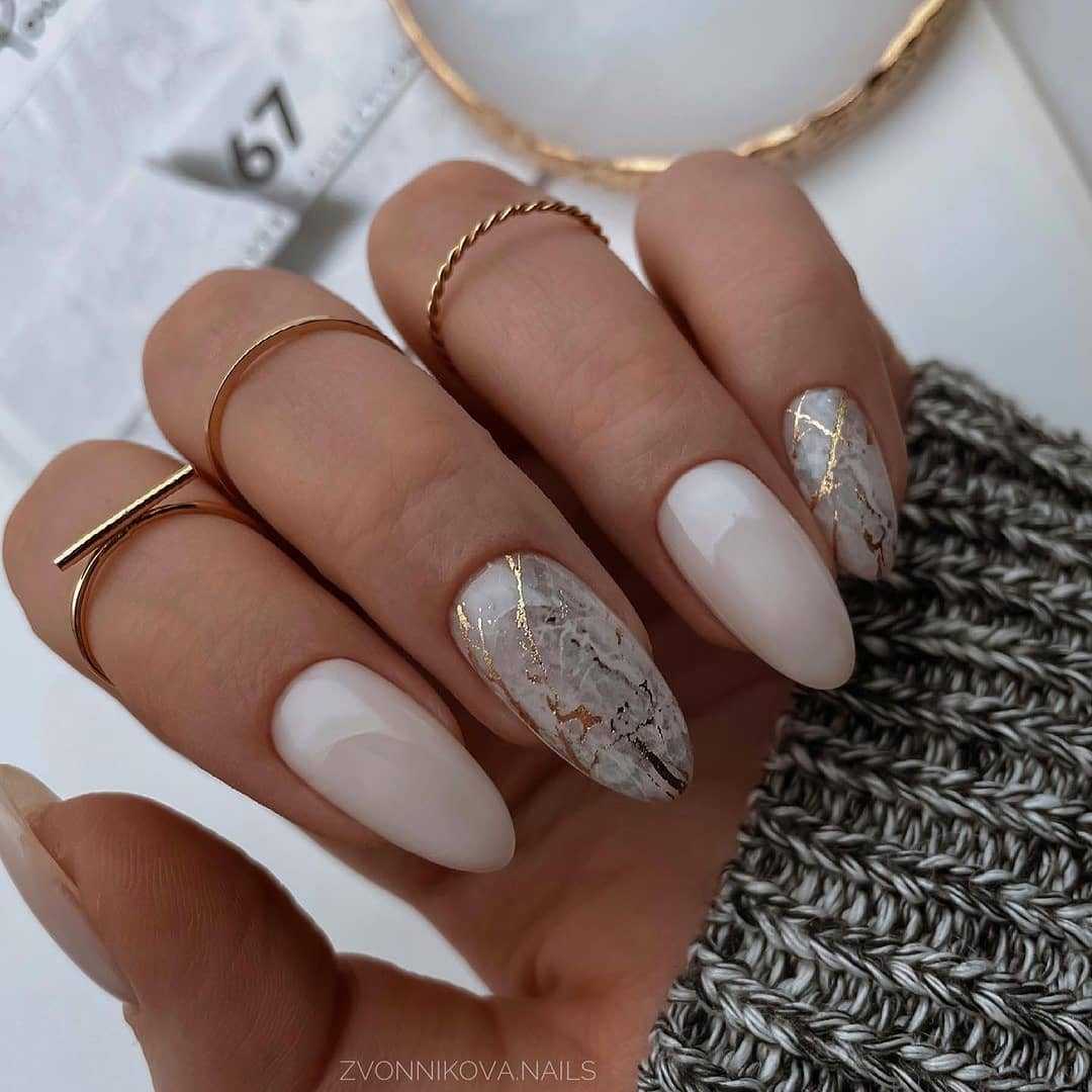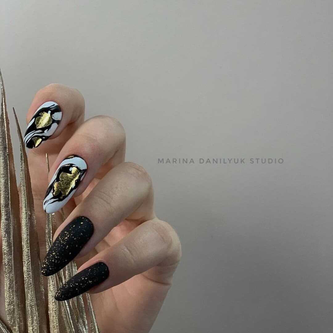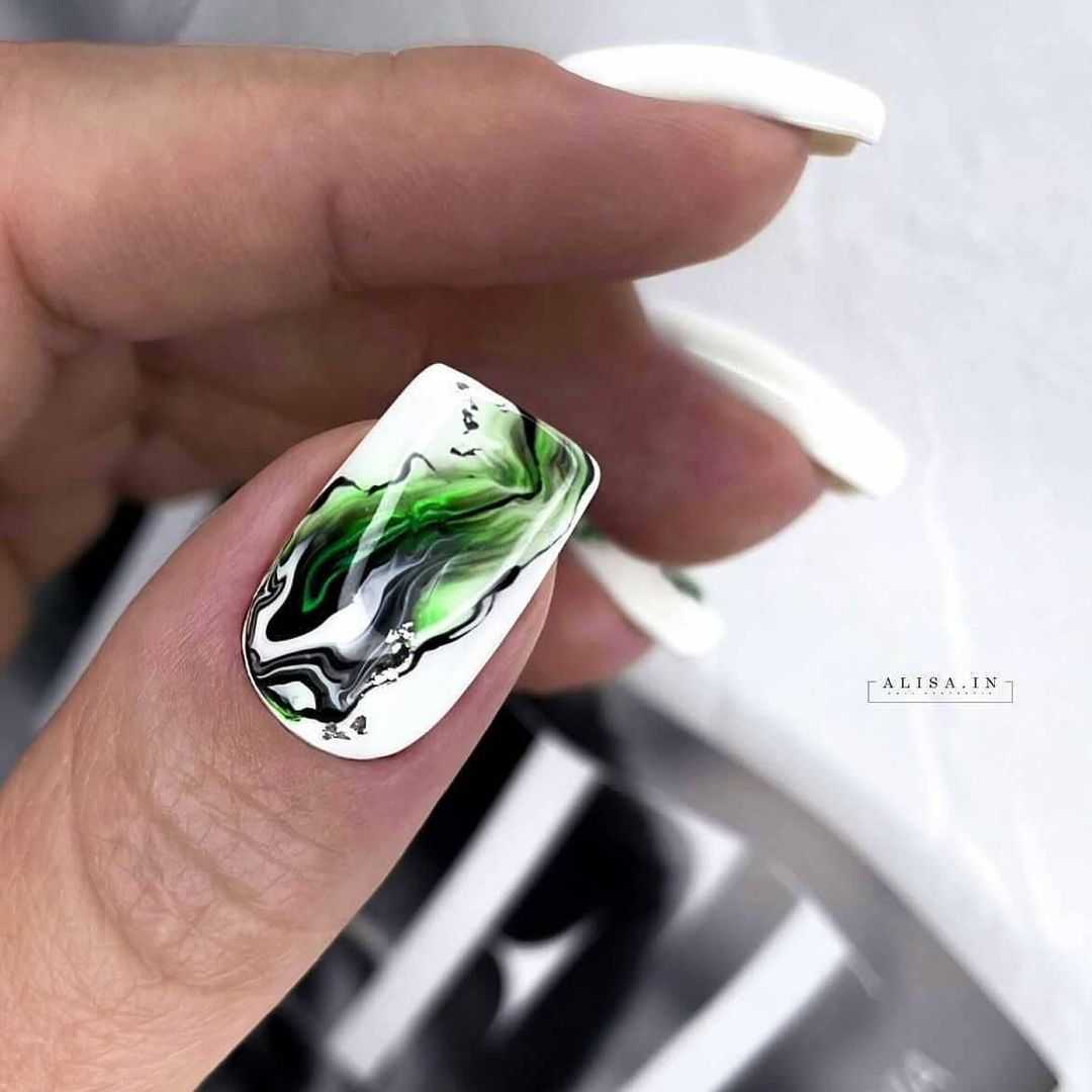Симпатичный мраморный эффект, характеризующийся сочетанием полос контрастных цветов, придает ногтям аккуратный и очень стильный вид. Более смелые женщины наносят мрамор на каждый ноготь, а любительницы минимализма могут выбрать нюдовый дизайн и покрыть этим эффектом только один ноготь.