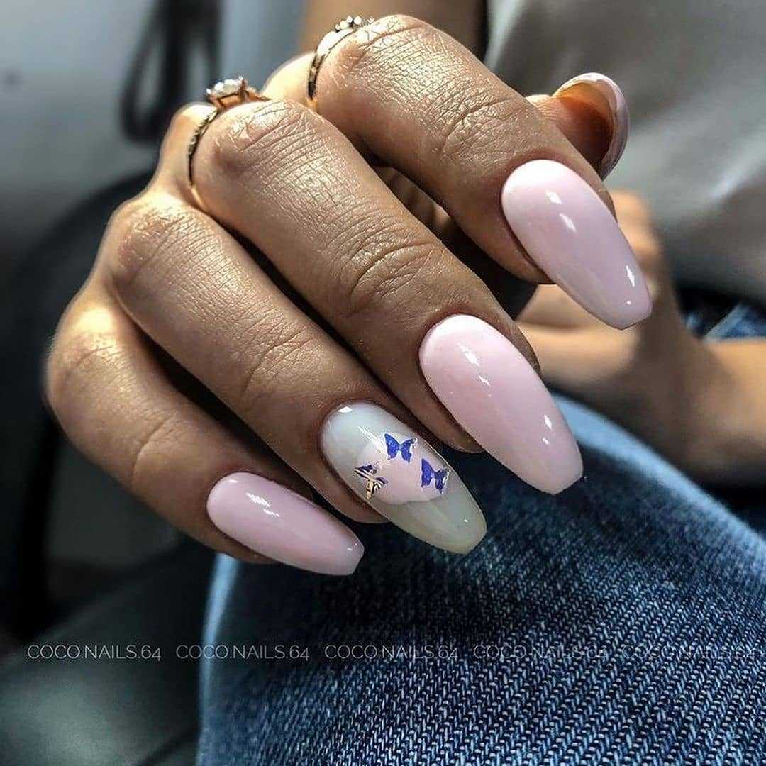 В этом сезоне, снова очень модным является дизайн с рисунками бабочек. Они символизируют лето, легкость и воздушность. Очень красиво и ярко смотрятся рисунки бабочек в сочетании с желтой, розовой и голубой основой. Если же, рисунки бабочек нанести на основу прозрачного, нюдового или молочного цвета, то такое сочетание будет смотреться очень нежно и утонченно.