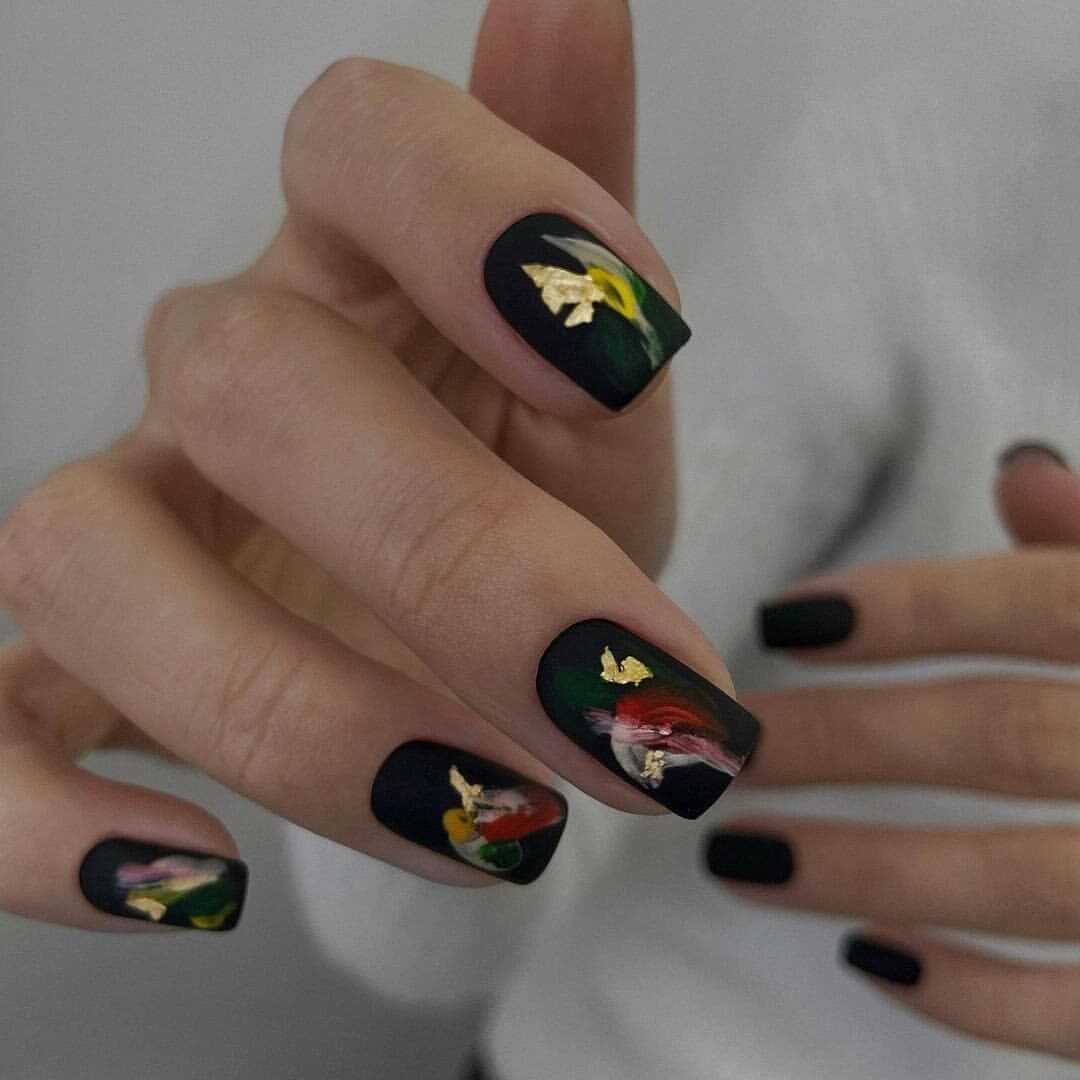 Маникюр с фольгой уместен как для ежедневной носки, так и для праздничного или вечернего стиля. Особенно торжественно и дорого смотрится вкрапление фольги в черный цвет. Из большого разнообразия можно выбрать любой ее оттенок.