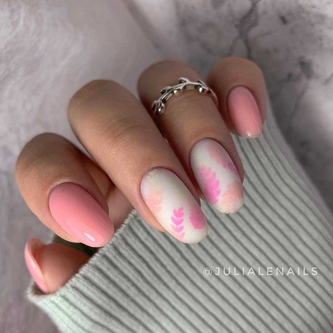 Последние несколько лет на пике своей популярности тенденция матового летнего маникюра. Нанесение мягких велюровых узоров на матовое лаковое покрытие является трендом в этом году, также будет популярна матовая радужная основа для лунного дизайна с добавлением сахарного песка на лунку под цвет основе.