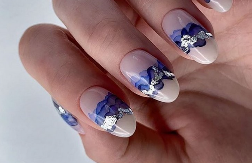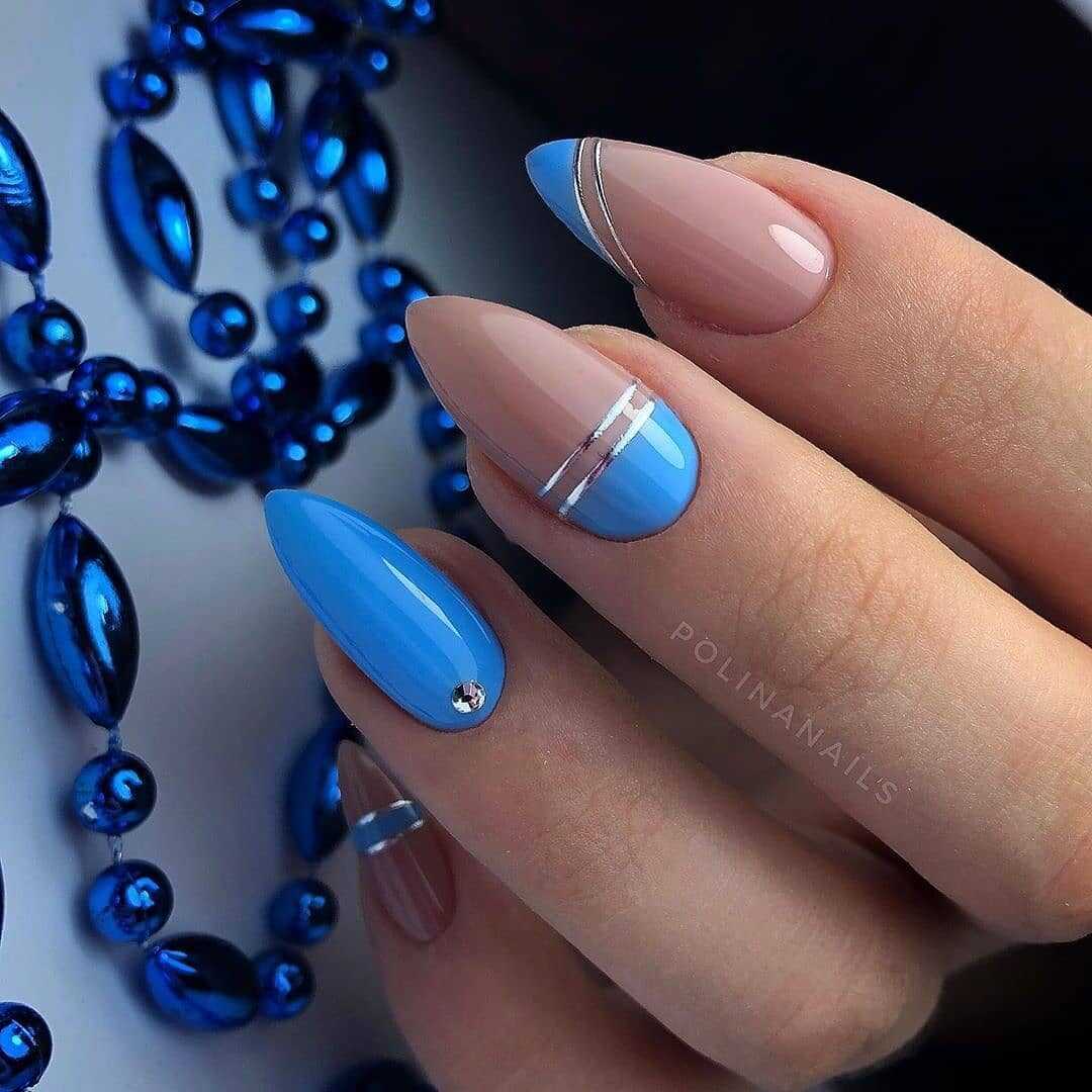 Самый глубокий цвет, комбинируется с белым тоном. Синий оригинально смотрится в маникюре с красным и чёрным. Светло-серый и синий подойдёт для будней и официальных торжеств.