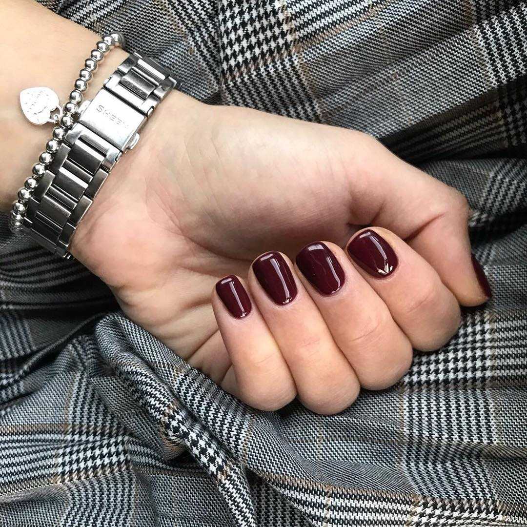 Классический маникюр для акцента на ногтях. Тёмные тона выделяют ногтевую пластину и сочетается с украшениями. Светлые и тёмные тона в одежде будут привлекательно выглядеть в дуэте с такими лаками.