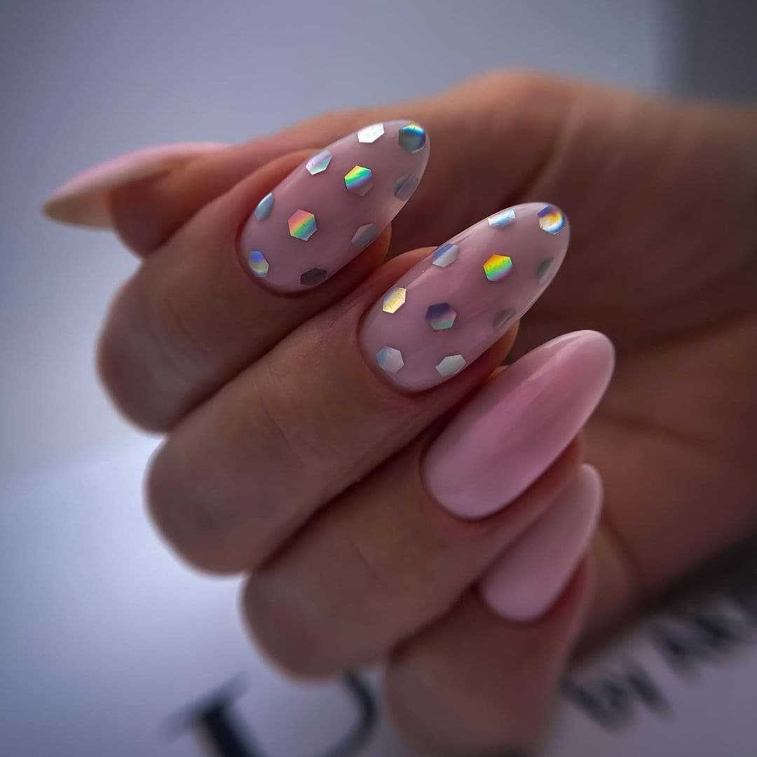 Еще одним ярким вариантом маникюра с декором является техника битого стекла. Создать такой маникюр достаточно легко с помощью такого декора, как нейл-фольга и голографический специальный дизайн.