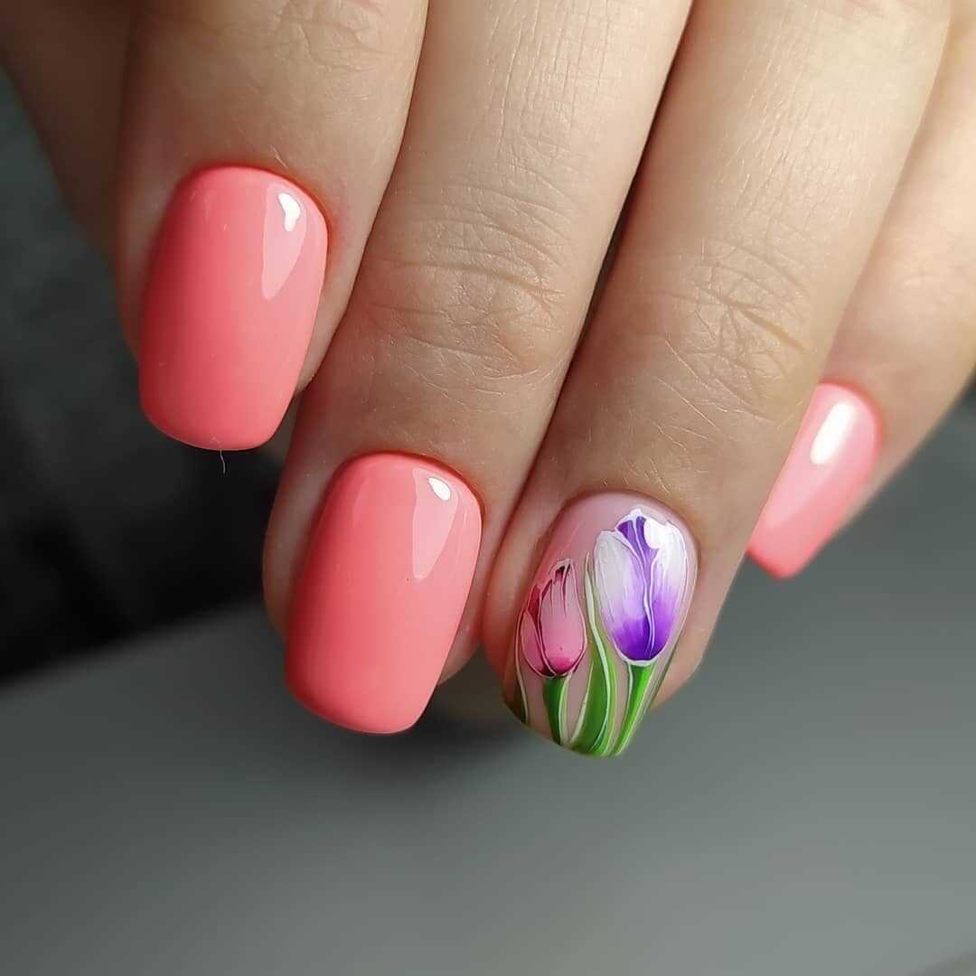 Летний маникюр с цветочками можно выполнять с элементами маленького и крупного размера, комбинировать несколько цветков в одном дизайне, украшать цветками, завитками, веточками только несколько ноготков, а остальные покрывать однотонным гель-лаком.