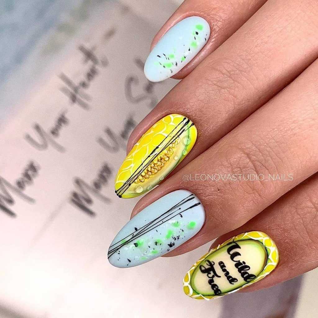 Цвет голубого летнего неба станет прекрасным вариантом для маникюра. Он подходит практически к любому оттенку кожи и добавляет завершающий штрих любому образу. Можно выбрать однотонный вариант, а можно сочетать его с фруктовым рисунком — оба дизайна будут выглядеть круто.