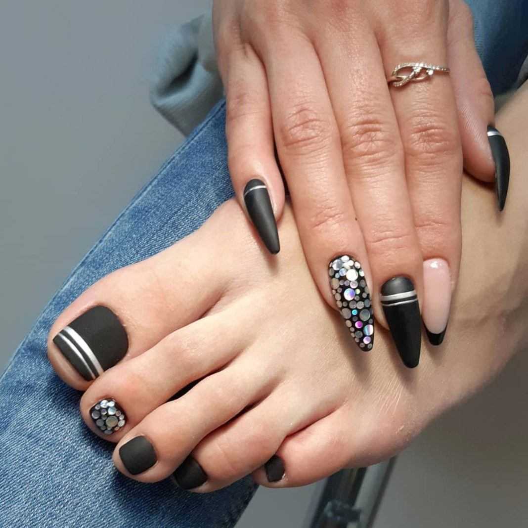 Неоспоримое достоинство черного цвета – сочетание с макияжем и одеждой. Маникюр гармонирует как в основе, так и в актуальных акцентах. На сегодняшний день дополнением будут украшения, которые разбавят его.
