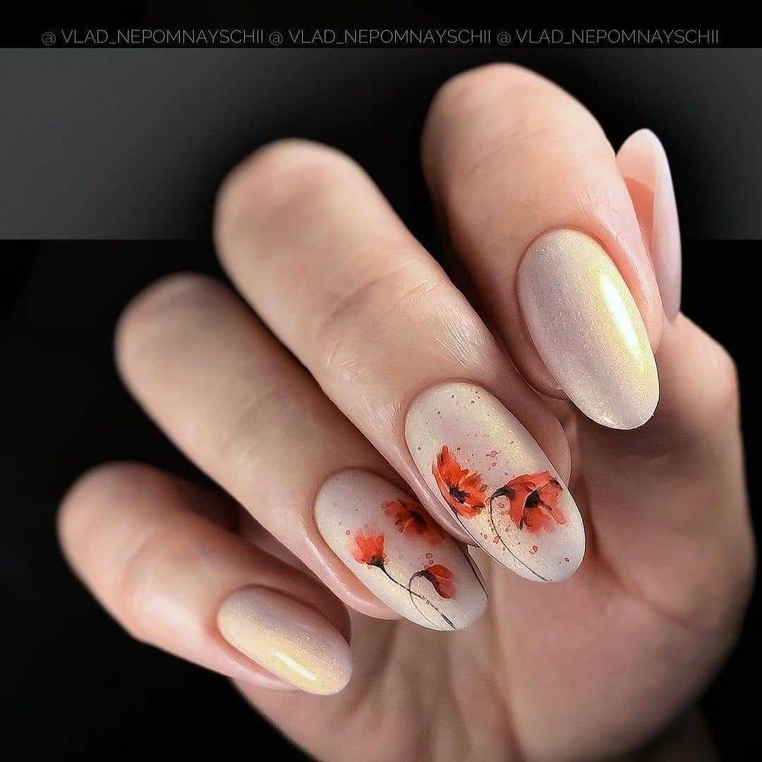 Номер три по-популярности — это рисунки различных летних цветов. Очень красиво и по-летнему нежно смотрятся рисунки: ромашек, пионов, маков, розочек, ноготков и различных других цветов, символизирующих лето. Причем, они очень красиво смотрятся как в ярком их исполнении, так и в нежных нюдовых тонах.