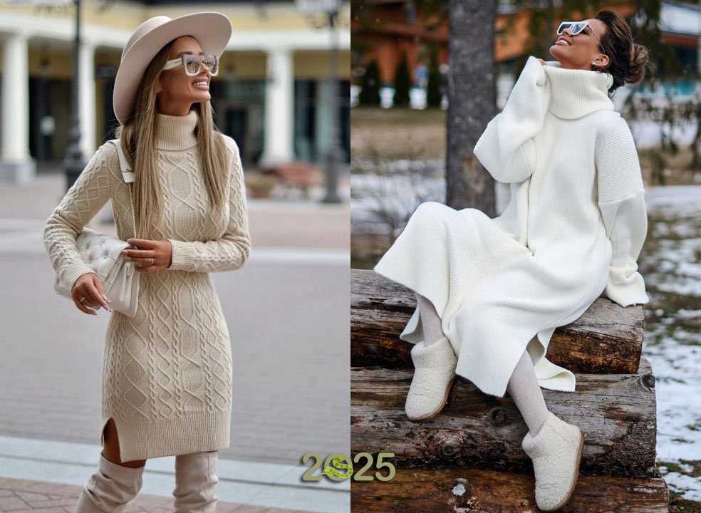 Вариант №1 – зимнее вязаное платье, которое подарит атмосферу тепла и уюта, смягчит образ и привнесет в него романтическую нотку.