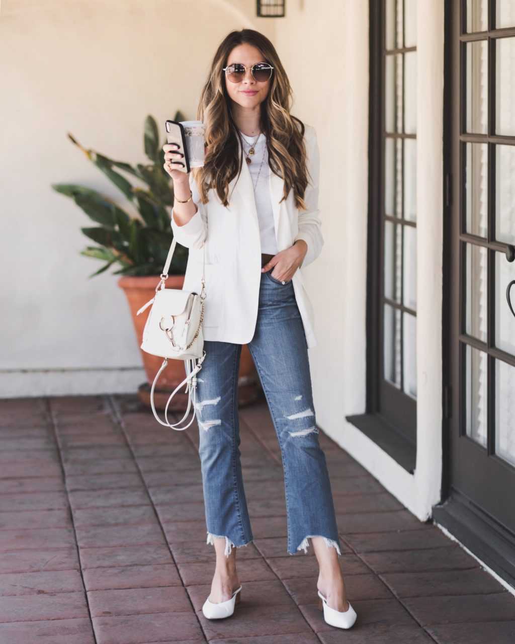 Основа стиля идет от легко комбинируемых вещей, например, джинсов. Они оптимально смотрятся со строгой рубашкой, топом романтического плана, свободной футболкой. Обуться можно в открытые босоножки, а также в ботинки при прохладной или дождливой погоде.