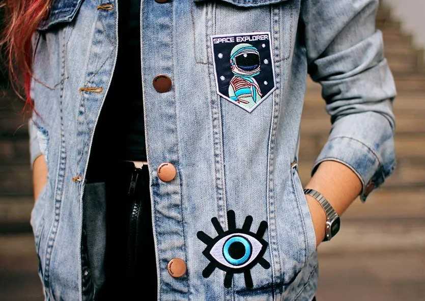 Это могут быть как маленькие тканевые изображения животных, названий любимых групп или прочих символик. Если хочется добавить в образ женственности и утонченности, то можно пришить кружева, главное – не переборщить с ними.