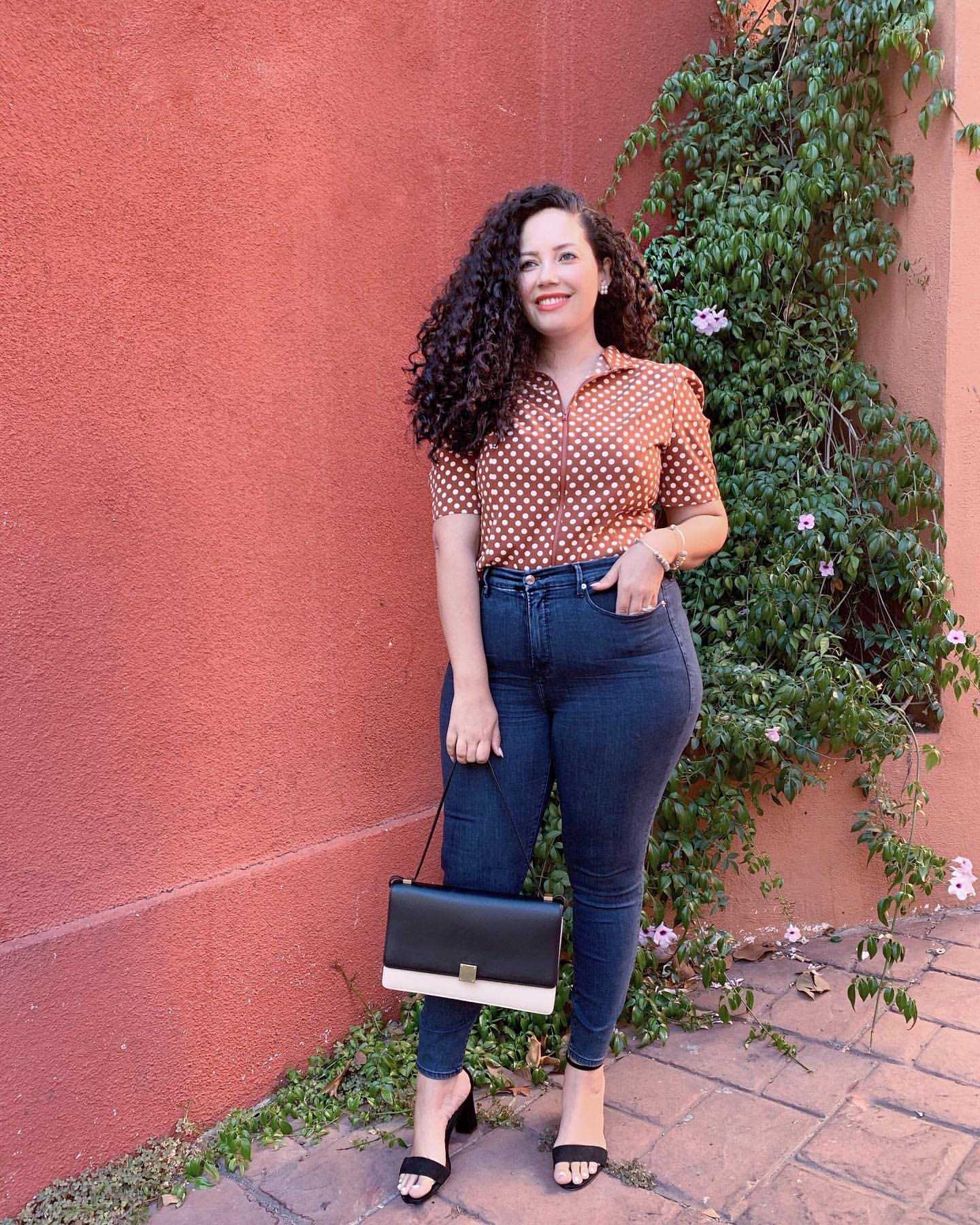 Женственный ансамбль состоит из цветных брюк до пола, серой рубашки в чёрный горошек, коричневой сумки-корзинки, удобных кроссовок. Дополнять образ украшениями необязательно, но по желанию можно надеть кольцо или серьги. Если станет холодно, следует накинуть плащ в тон сумке.
