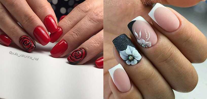Выполняя подобный дизайн, нужно рассчитывать лишь на свою фантазию. Наиболее красиво выглядит акриловая лепка, расположенная в толще гелевого покрытия. Цветы, камни и прочие элементы выглядят красиво, однако ногтевая пластина слишком увеличивается в объеме. Такой дизайн прекрасно подходит для торжественного случая. Можно выделить наиболее яркие и красивые идеи: