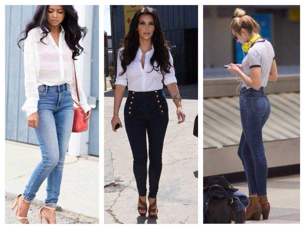 - высокая. Джинсы достигают естественной линии талии чуть выше пупка и считаются ретро-стилем. Они зрительно удлиняют ноги, но при этом укорачивают верхнюю часть тела, поэтому не подходят девушкам с коротким туловищем. Эластичные брюки с высокой посадкой отлично выглядят на фигуре «песочные часы», т. к. подчеркивают узкую талию. Надевайте укороченные топы и рубашки, заправляя их в штаны;