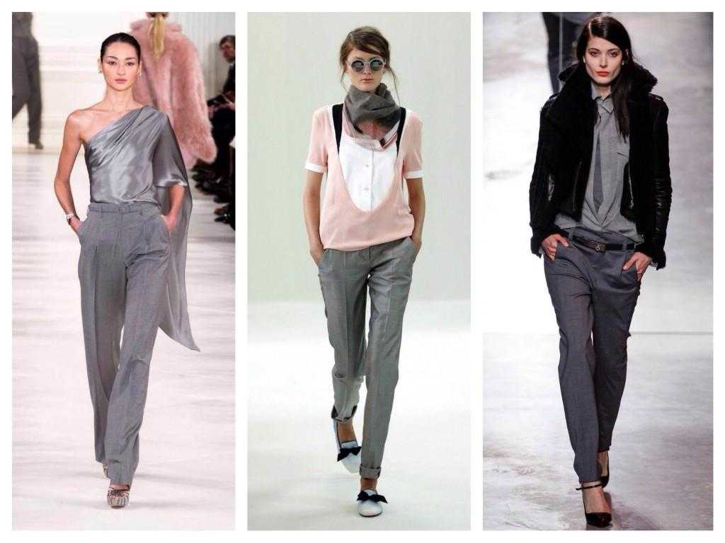 Девушкам с аппетитными формами подойдут брюки темных оттенков. Черные модели прямого кроя – идеальное решение, чтобы сделать фигуру более стройной. Одежда шоколадного, насыщенного синего, фиолетового, темно-зеленого и серого цветов разнообразят гардероб. Освежить образ можно светлой блузой или украшениями.