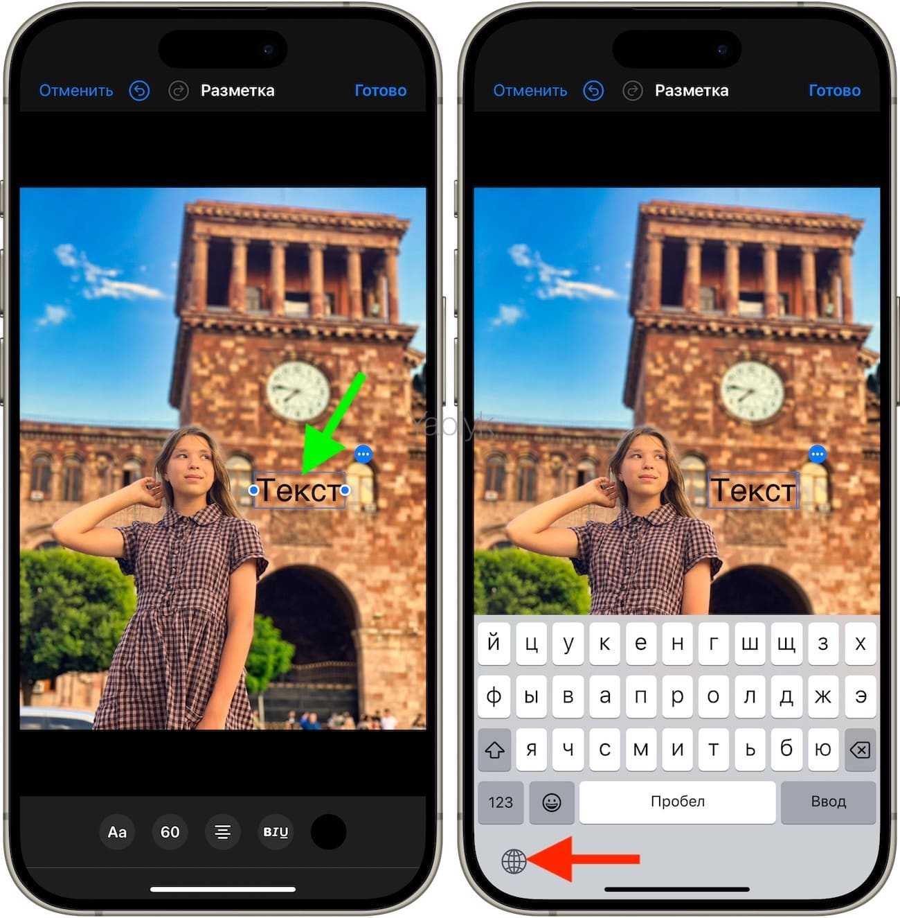 4. В рамке на экране вы увидите слово «Текст». Коснитесь его, чтобы открыть клавиатуру. Удалите слово «Текст» и переключитесь на клавиатуру со смайликами Эмодзи.