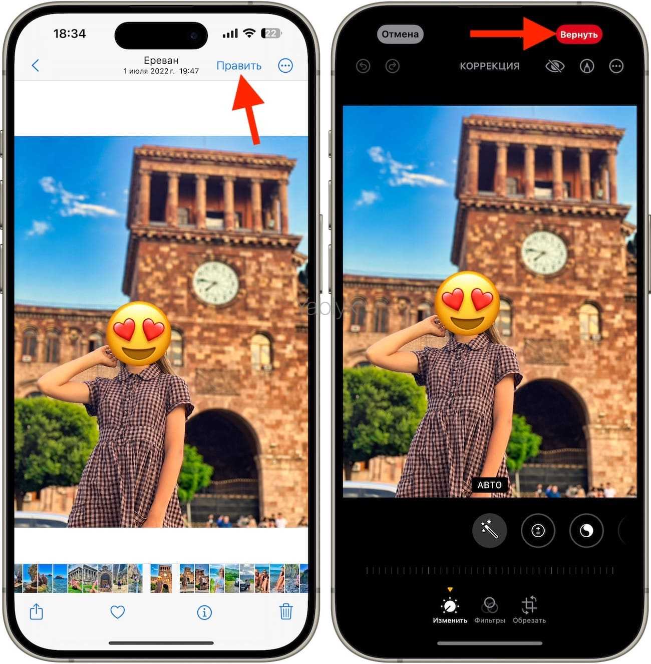 Удаление смайликов. Откройте отредактированное изображение в приложении «Фото» и коснитесь «Править» → «Вернуть» → «Вернуть к оригиналу», чтобы удалить добавленные смайлики.