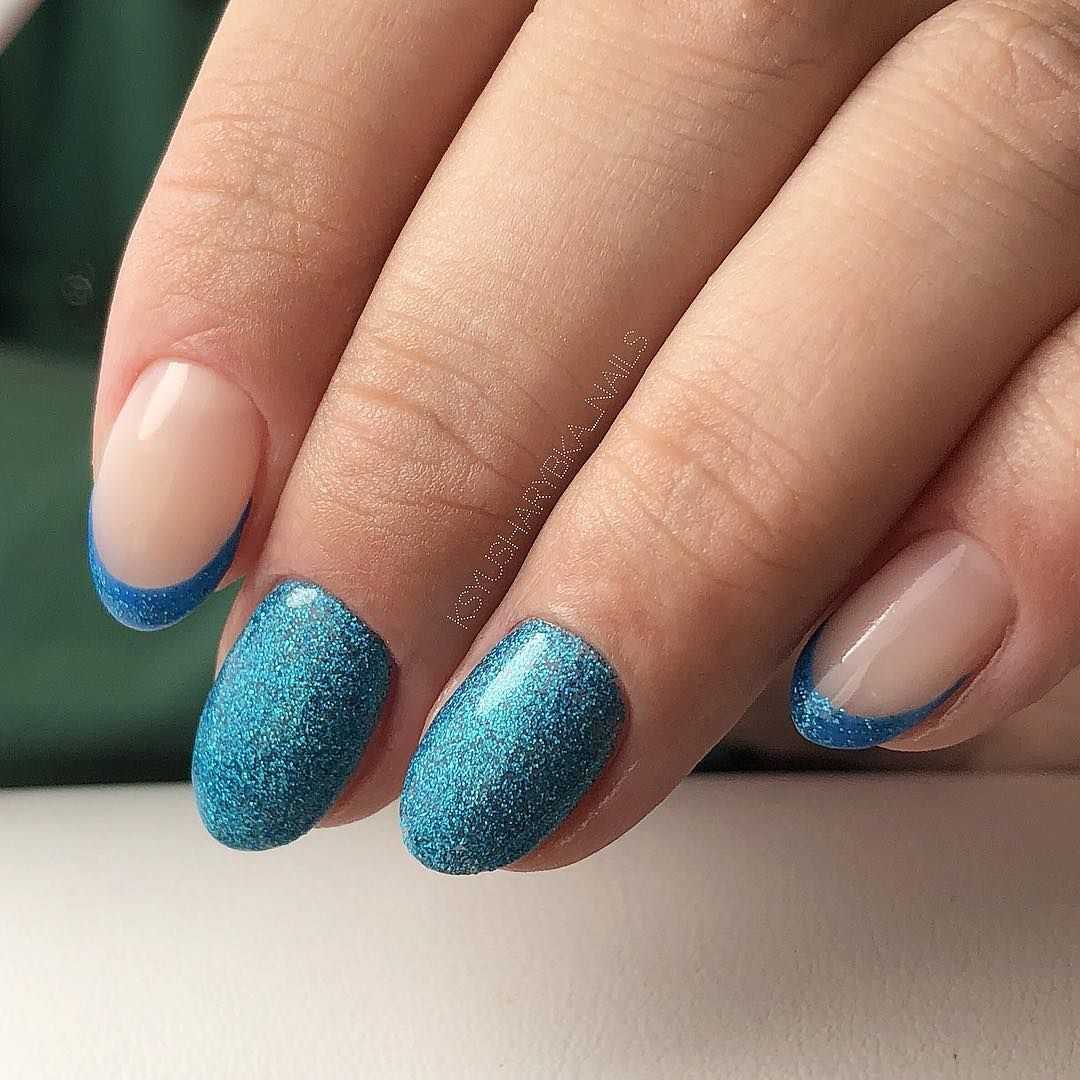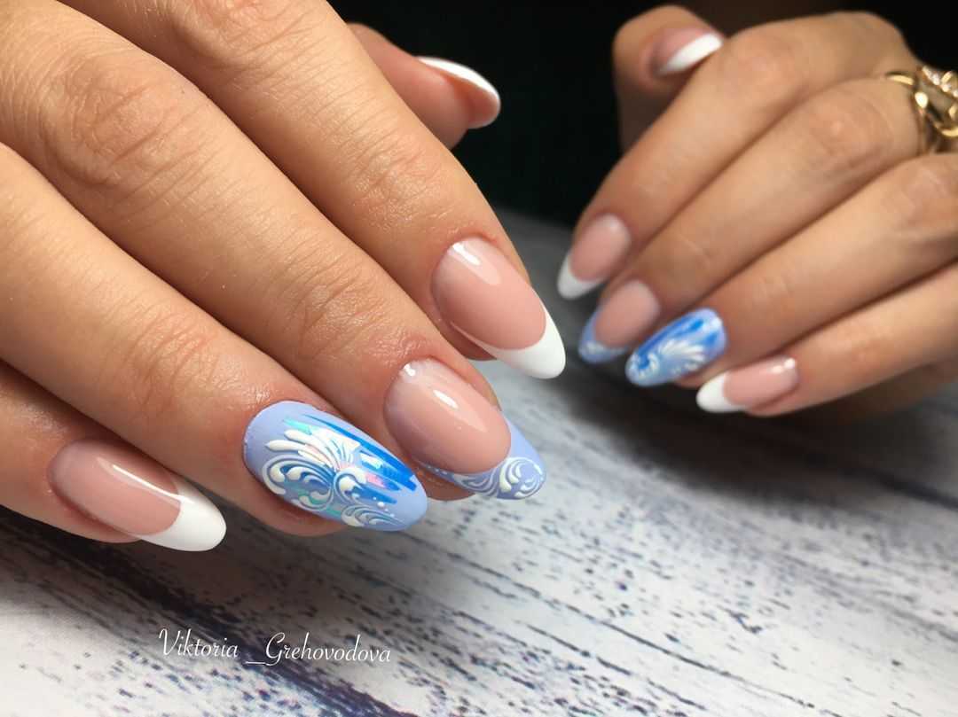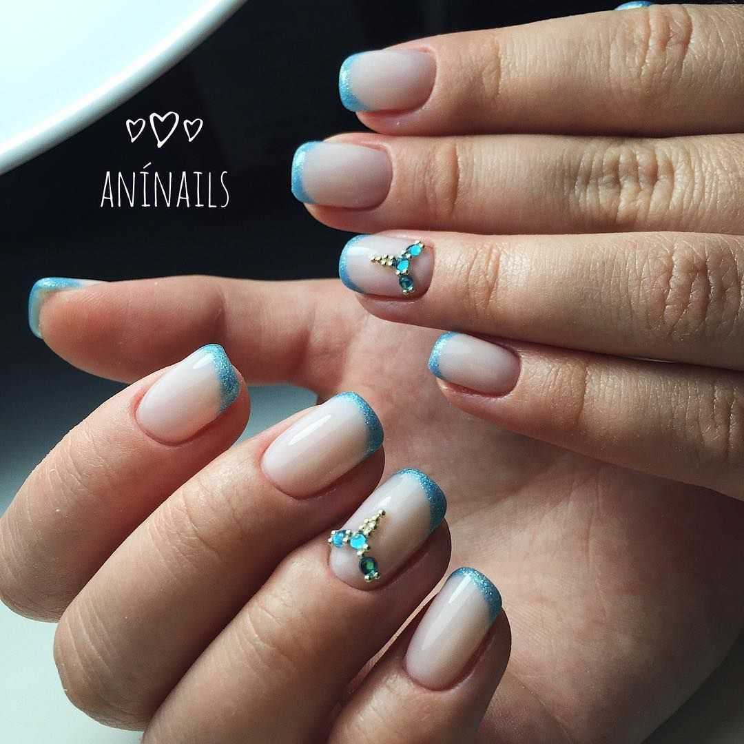 Предпочтительно это классический или лунный французский маникюр в голубых пастельных тонах, с аквариумным акцентом на нескольких пальцах.