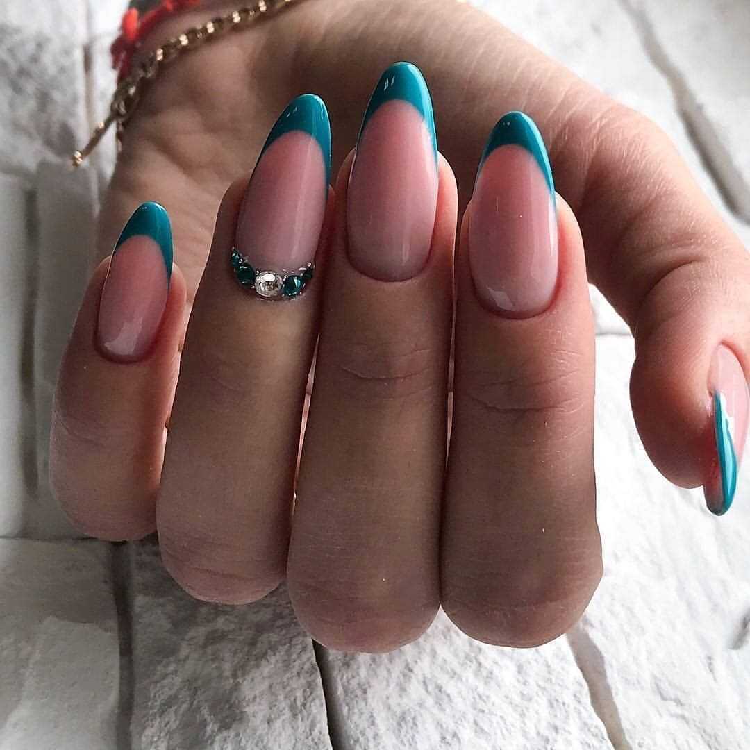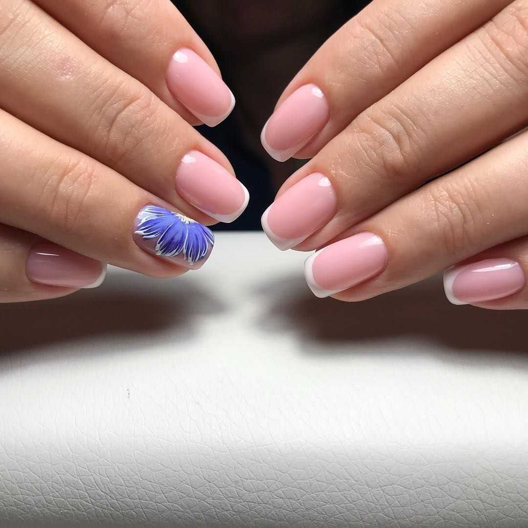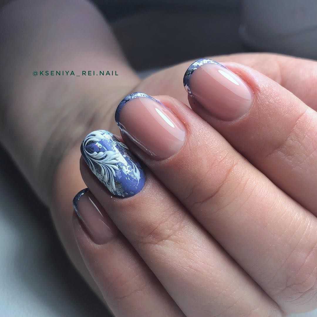 Предпочтительно это классический или лунный французский маникюр в голубых пастельных тонах, с аквариумным акцентом на нескольких пальцах.