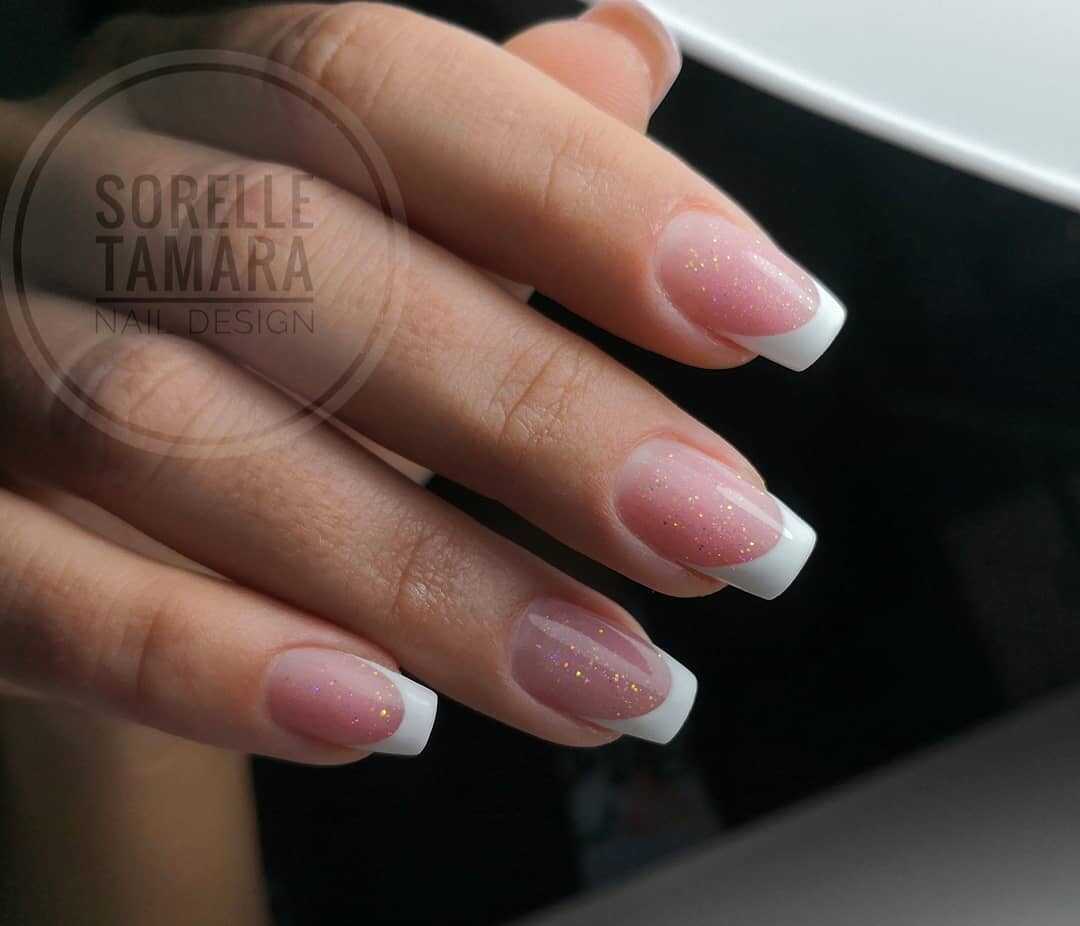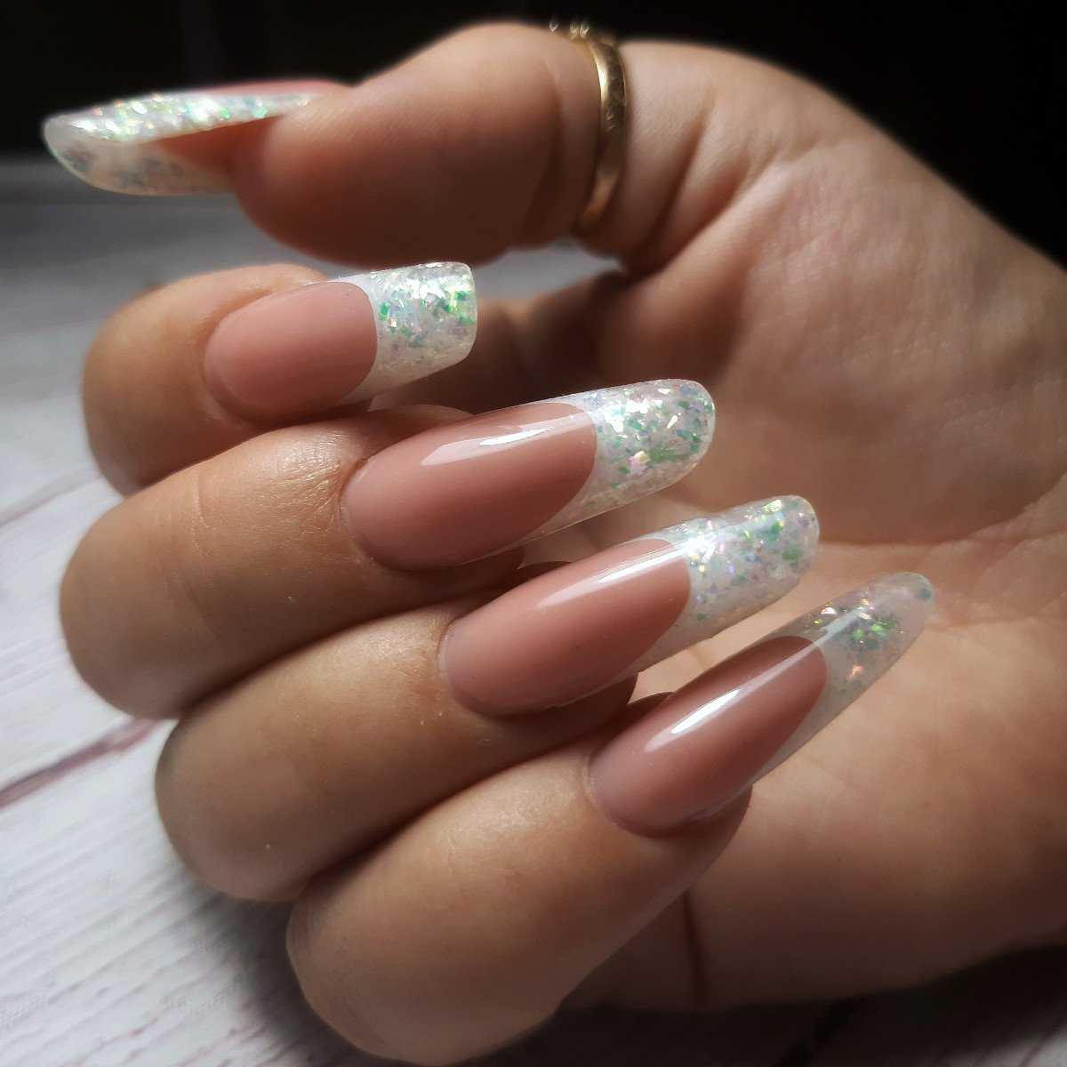 Чтобы придать этому образу особый вид, сделайте обычный французский маникюр, затем добавьте блеск. Убедитесь, что блеск находится только на основании ногтя, а не на кончиках. Это позволит добавить дополнительный контраст между основанием и кончиком ногтей. Этот стиль более динамичный и изящный в сравнении с обычным французским маникюром.