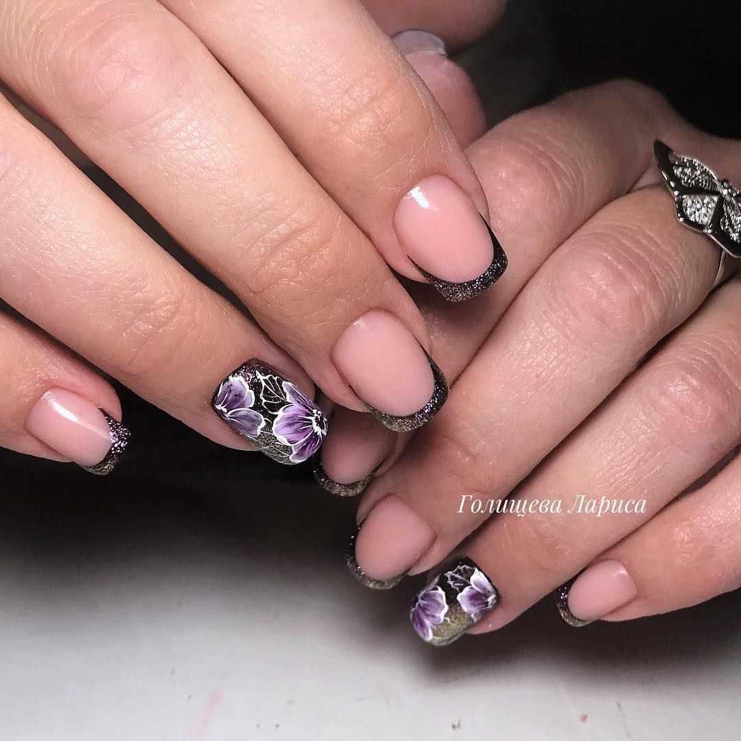 Если речь идет о каком-либо особом случае, будет как никогда кстати цветочный френч в технике «разные руки» — это когда на одной руке оформляется обыкновенный стандартный французский маникюр, а на второй руке делается френч с цветочными узорами вместо стандартных «улыбок» на кончиках ногтей. Да, смотрится такой вариант совершенно необычно, ведь руки получаются абсолютно разные. Та рука, которая делается с цветочными мотивами, оформляется на спокойной нюдовой основе. Вторая рука также подбирается на точно такой же основе, но только выполняется классически. Для того, чтобы разница слишком сильно не бросалась в глаза, можно на руке, оформленной стандартным образом, выделить один палец в таком же оформлении, в котором сделана вся вторая рука. Так дизайн будет «перекликаться» и не будет такой явной разницы.