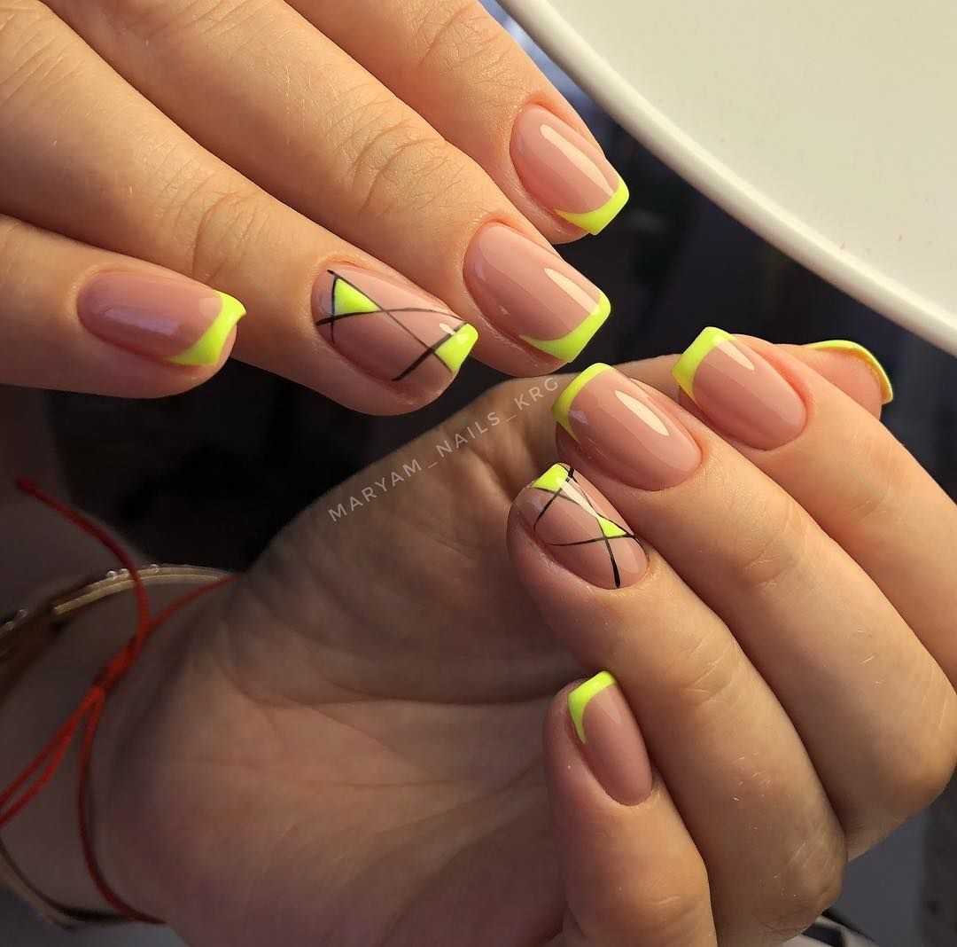 Сдержанный и лаконичный френч 2024-2025 с рисунками геометрических фигур, точек, линий, зигзагов, а также минималистичный френч подойдет для утонченных девушек, а также это отличный офисный маникюр в деловом стиле.