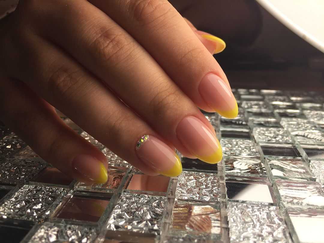 Одна из самых интересных современных тенденций — это разноцветный френч. Это дизайн, когда каждый из ноготков оформляется в свой цвет. Чаще всего такой прием используют летом. Мастера не рекомендуют перегружать такой маникюр другими элементами декора. А для базы стоит выбрать максимально нейтральный оттенок. Например, молочный, нюдовый, любой пастельный. Если хочется добавить декора, рекомендуем выбрать один акцентный палец на руке и нанести на него, например, рисунок стразы.