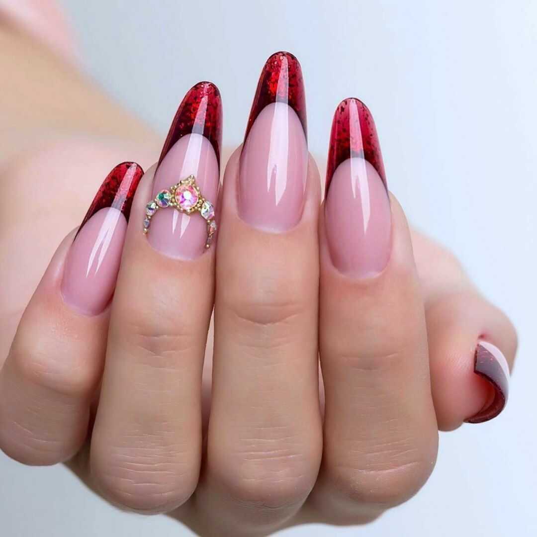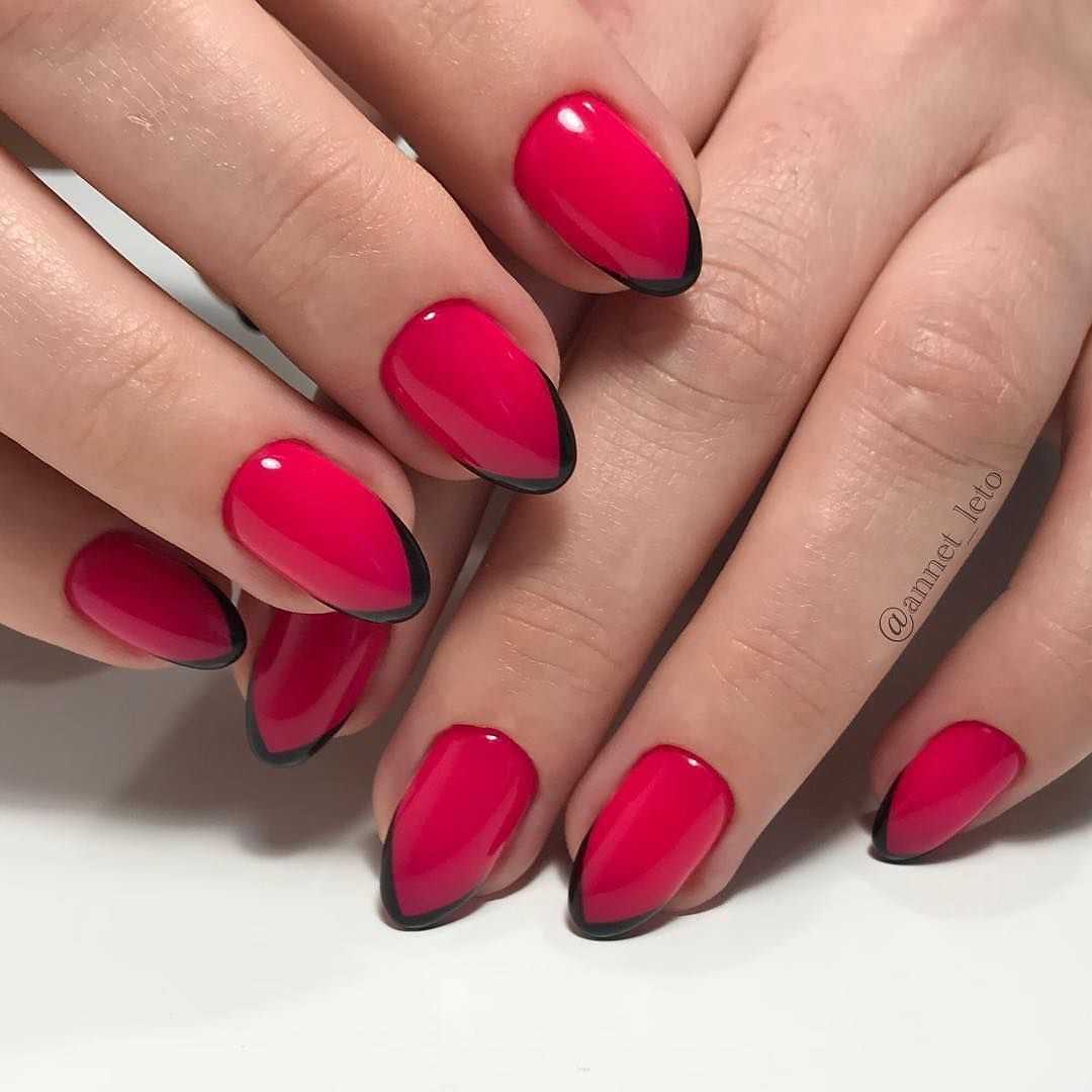 Еще один необычный вариант для создания френча. Это вариант для тех, кто любит красные лаки в маникюре, но не готов делать однотонный сплошной дизайн. Такой френч выглядит необычно и очень стильно. А главное — женственно.