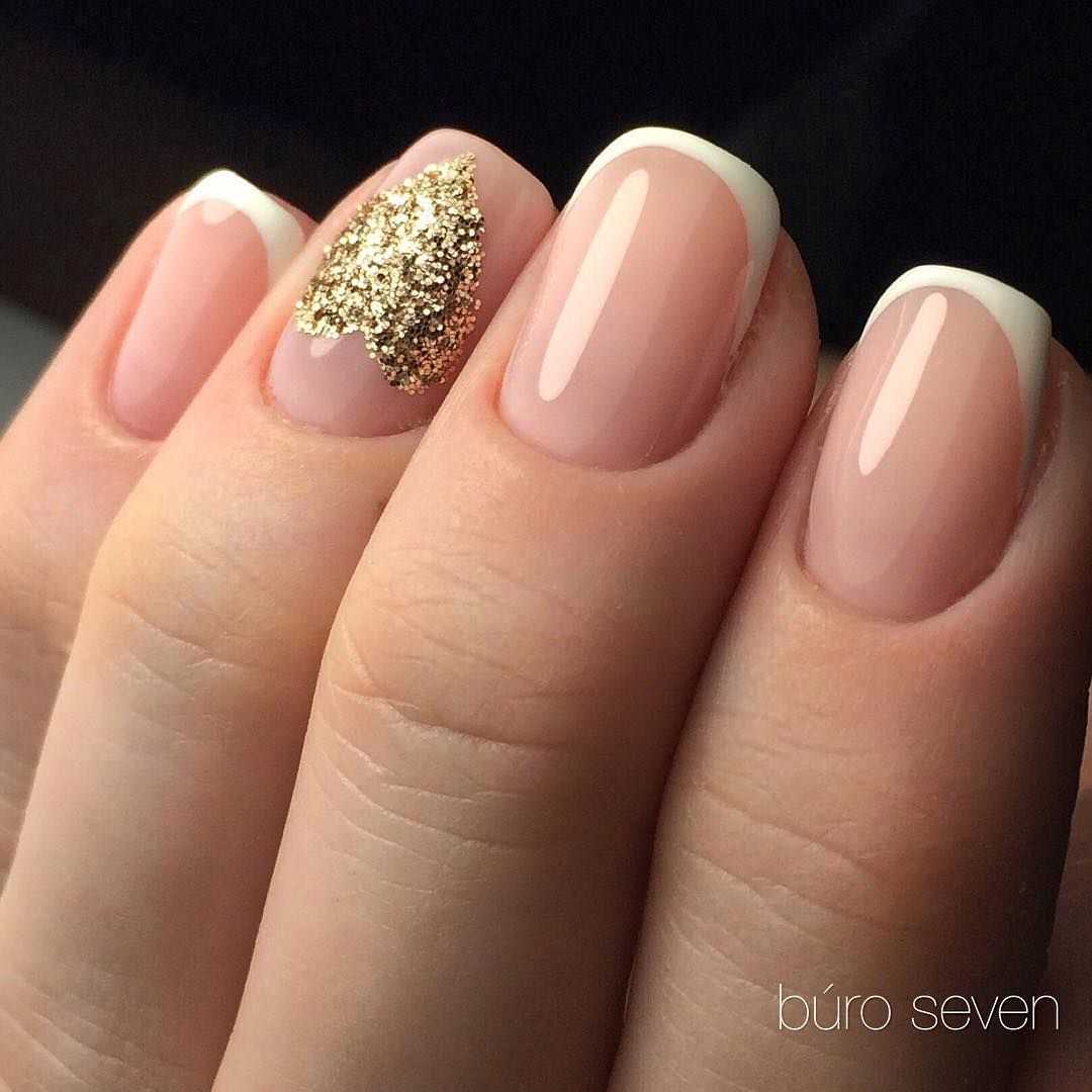 Еще один простой способ украсить обыкновенный вечерний образ – это сделать красивый французский маникюр с золотом, который будет выглядеть поистине шикарно и изысканно. Можно выбрать красивые крупные камни, стразы или кристаллы, а также разбавить всю композицию бульонками. Получится очень нежный, и очень модный вариант.