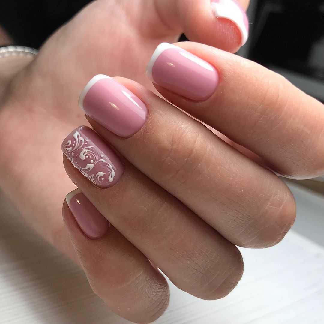 Вечерний французский маникюр не обойдется без кружевных мотивов, вензеля и милых завитков, выполненных в нежных и контрастных оттенках, что делают маникюр нежным и изысканным.