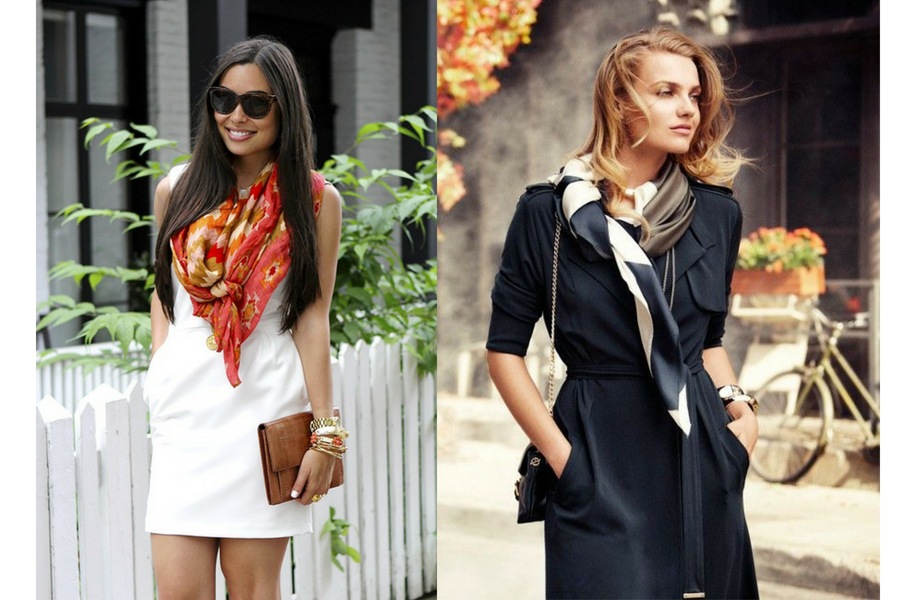 Многие стилисты советуют модницам выбирать шарфики и платки, изготовленные из материала, который немного тоньше, чем тот, из которого сшита одежда. При этом, аксессуары с пестрыми орнаментами гармонично смотрятся с однотонными изделиями, а к ярким вещам с крупными принтами больше подходит однотонный аксессуар.