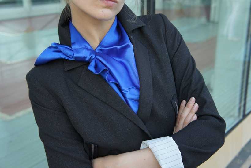 Начнем с простейшего примера того, как часто сочетается деловой костюм. Завяжите узелок и аккуратно оберните концы вокруг шарфа. Среднюю модель можно завязать как галстук поверх рубашки или блузки. Концы можно оставить сверху или спрятать внутрь.