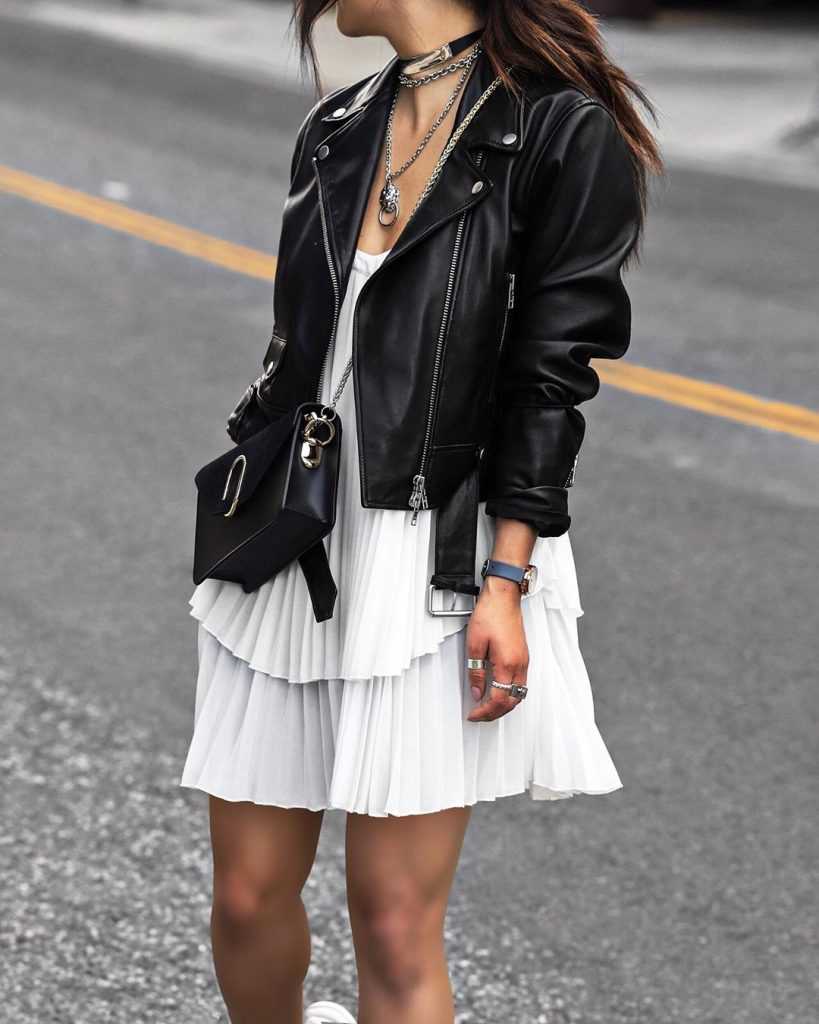 Сочетание белой косухи с юбкой и каблуками создает очень элегантный образ. Этот вариант идеально подойдет для специальных случаев, таких как свадьбы или выпускные вечера.