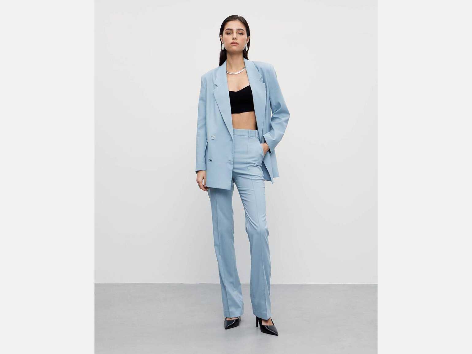 - пиджак с подплечниками, легкая блуза и свободные брюки;