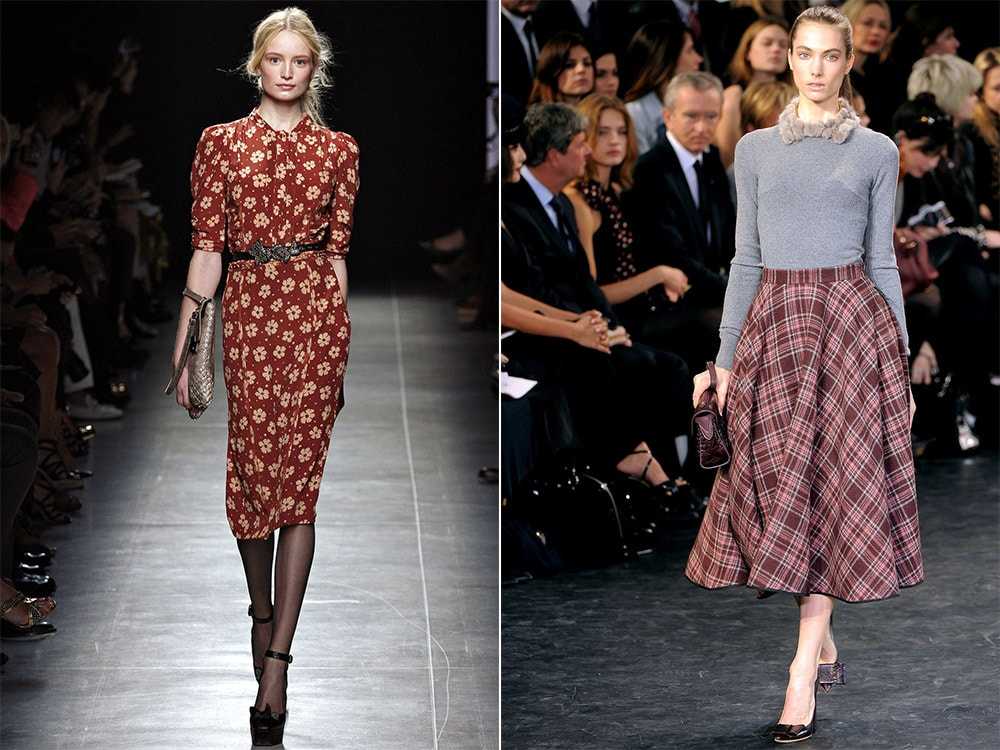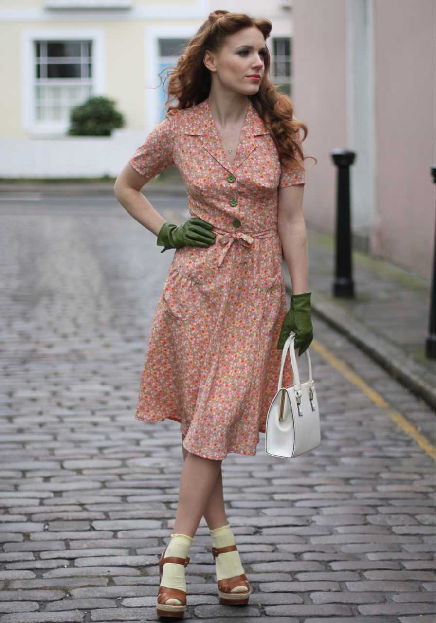 1940-е годы: клетчатые твидовые и шерстяные юбки, сумки и обувь из кожи рептилий, туфли на платформе, броши, шляпы, чайные платья, модные цветочные принты.