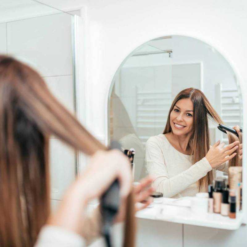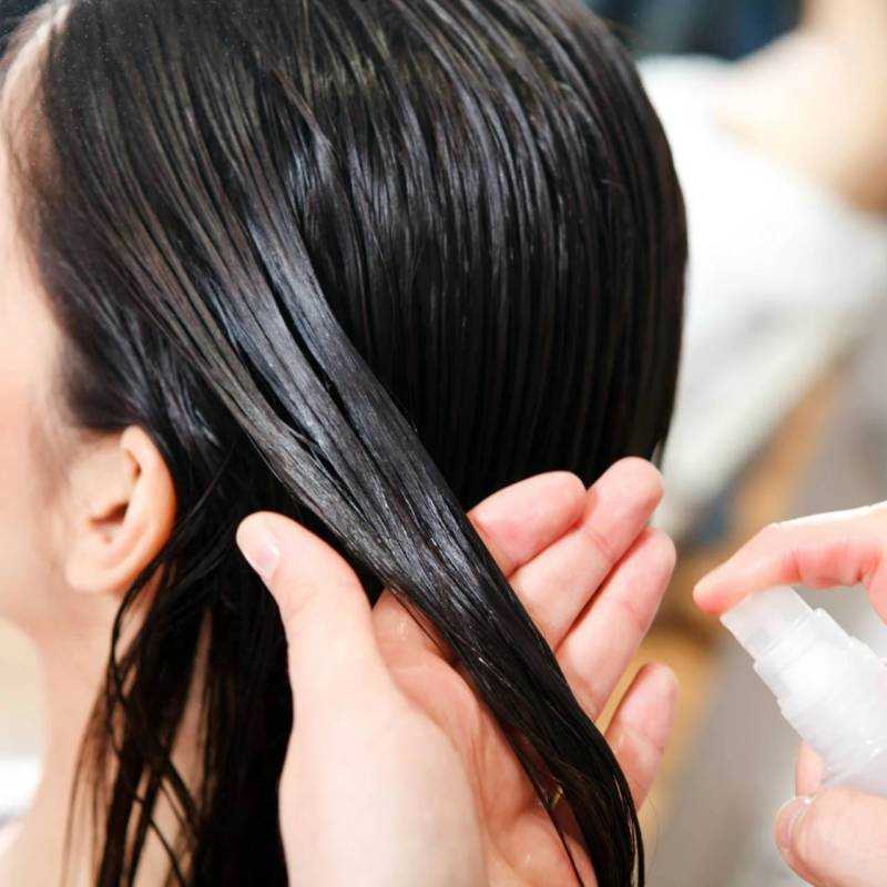 - На чистые волосы наносим косметическое средство защищающее кутикулу волос от воздействия высокой температуры