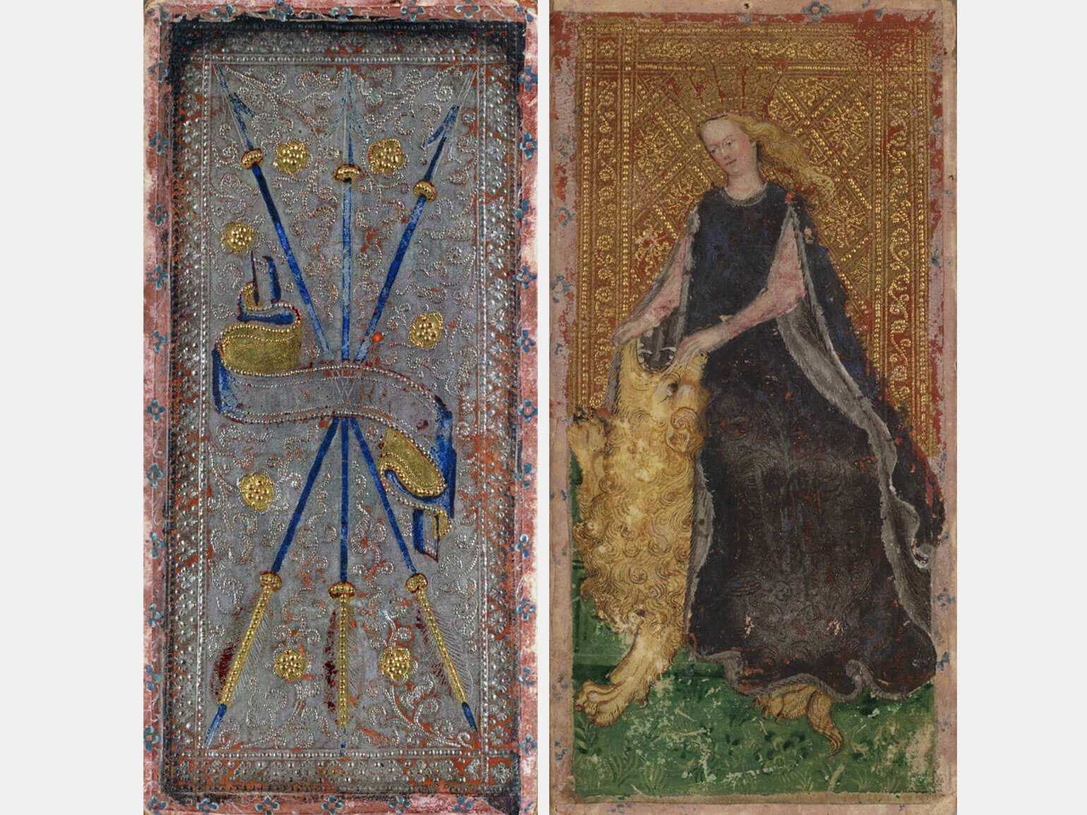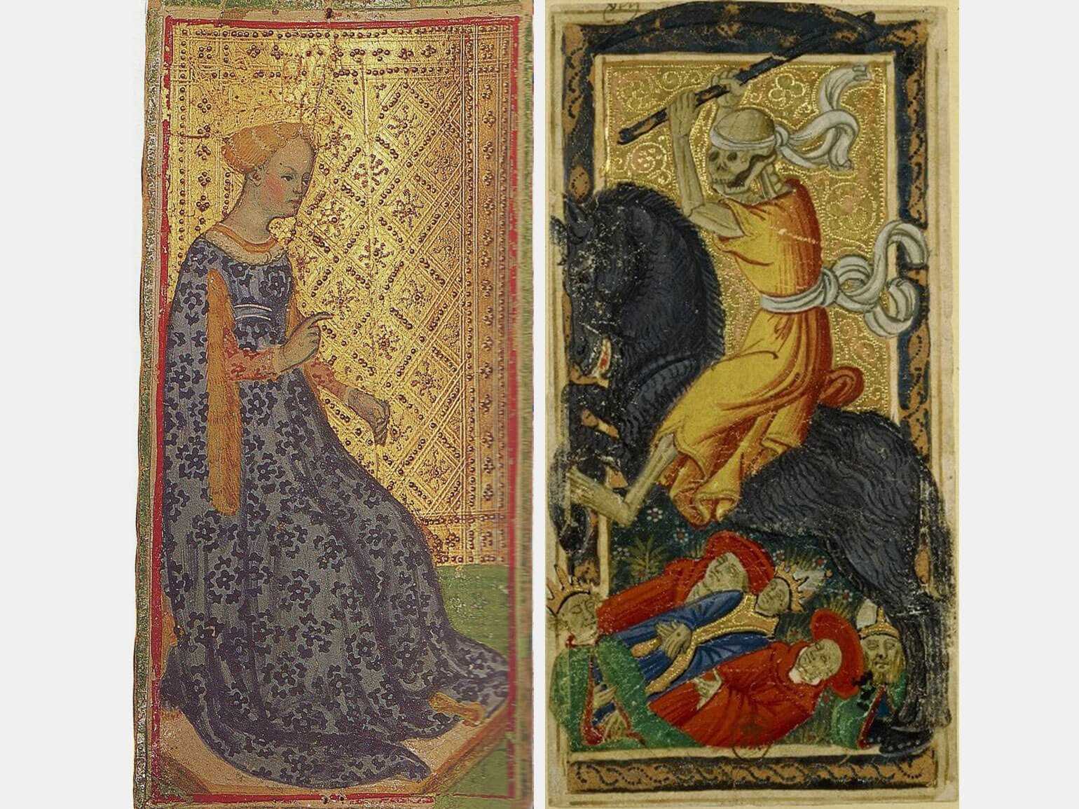 Игральные карты для тарокки: «Тройка мечей», «Сила», «Королева посохов» (колода Висконти — Сфорца) и карта «Смерть» (колода Карла VI)Изображение: Pinacoteca di Brera / Bibliothèque nationale de France