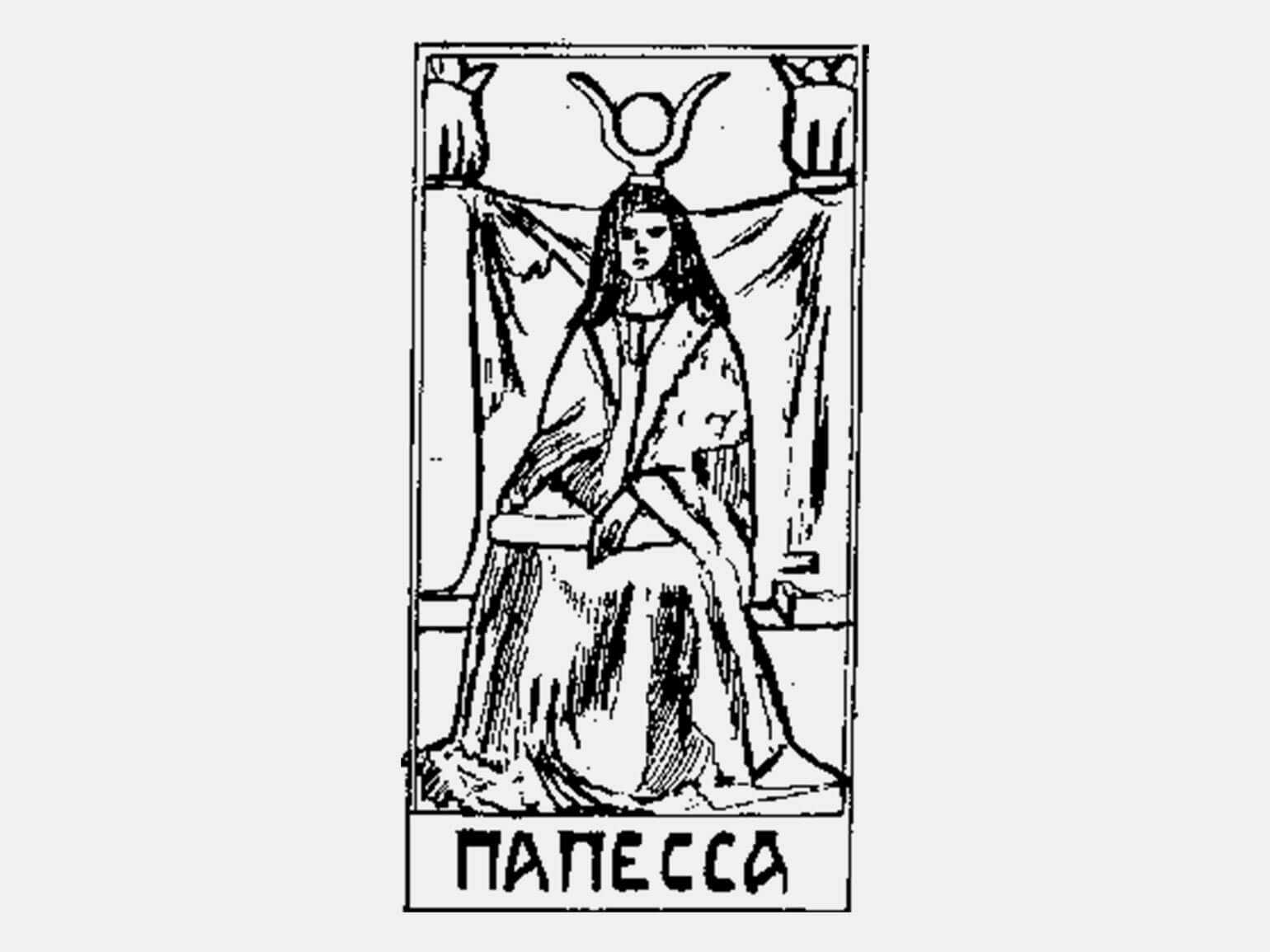 Сам дизайн оказался максимально простым: плоскостное рисование, отсутствие цветов компенсировались богатой символической нагруженностью. На картинке — папесса, старший аркан с древнеегипетским украшением, две колонны символизируют масонство, а натянутая ткань — тайну. К картам прилагалась книга с толкованиями и объяснениями (очень запутанными) различных схем гадания.