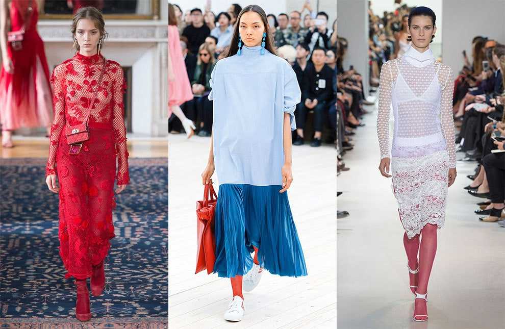 Весной и летом актуальны модели с рисунком или аппликациями. К ним уместно надевать нечто монотонное, дабы избежать визуальной перегруженности. Укороченные юбки и романтичные платья — прекрасный выбор. С «кружевными» ножками сочетайте более закрытые платья и юбки ниже колена.