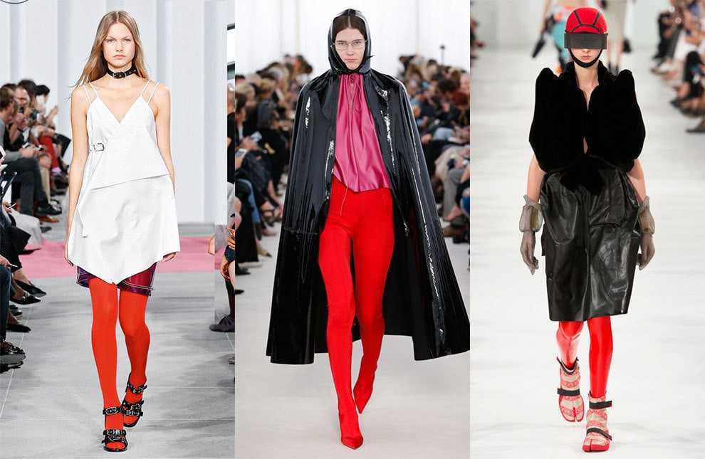 Уже 20 лет спустя красными колготками увлеклись все известные бренды. Дизайнеры Carven, Givenchy, Céline призывают комбинировать красные колготы с макси, мини и даже с ажурными платьями.